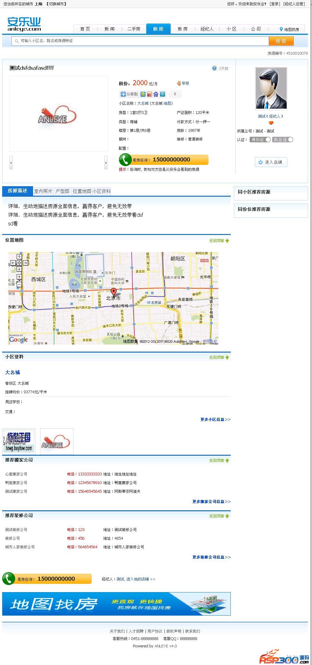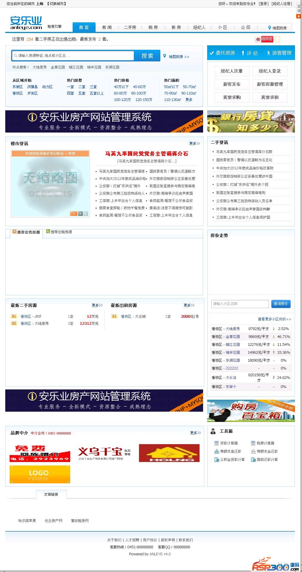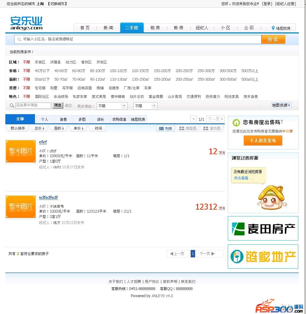 程序介绍:安乐业是一套以PHP+MYSQL开发的房产网站管理程序,支持伪静态,带地图搜房,栏目设有:二手房、租房、新房、经纪人、小区信息、公司等。