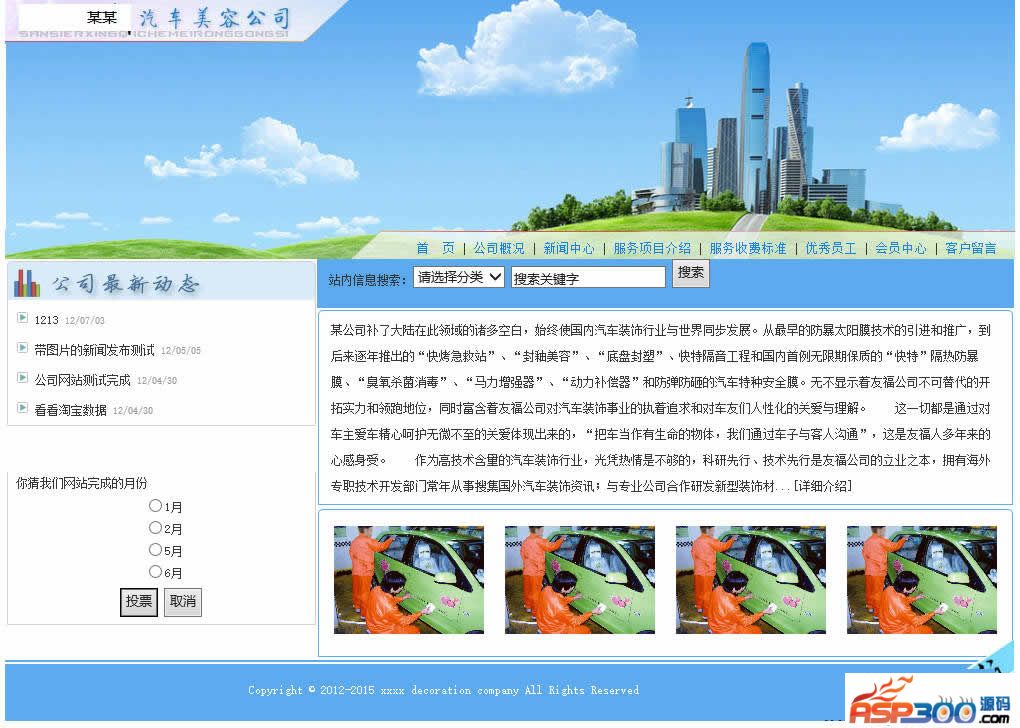 一个简单精美的汽车美容店网站,实现了公司介绍,新闻中心,服务项目介绍,服务收费,优秀员工展示,会学、会员展示,客户留言的页面。