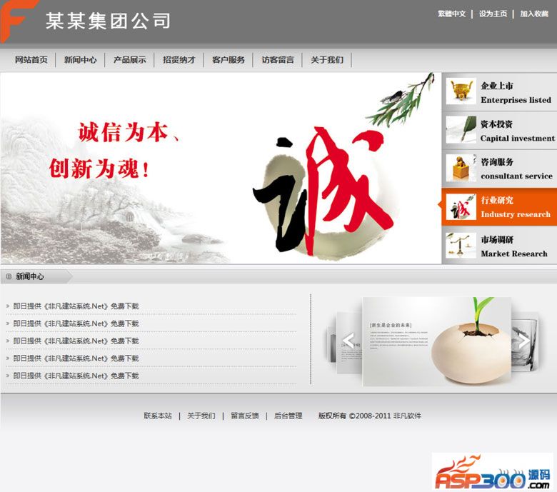 漂亮的集团公司网站。适用于酒店,宾馆,饭店等集团公司使用。用途范围全面,广泛,淡雅的背景颜色,配以若隐若现的水墨山水,和灵鸟的卧柳枝既高贵,脱俗又寓意着春的朝气;站内分类简洁,LOGO布局清晰,企业以诚信为本,创新为魂的主题醒目。站内特有的五项服务可以让访客更有目的,有针对性的了解集团公司。