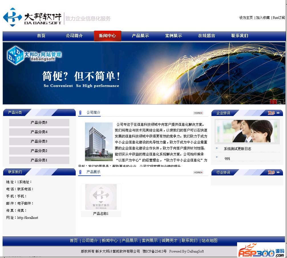 秉承"大道至简 邦达天下"的设计理念,以灵巧、简单的架构模式构建本管理系统。可根据需求可配置多种类型数据库(当前压缩包支持Access).系统是对多年企业网站设计经验的总结。特别适合于中小型企业网站建设使用。压缩包内包含通用企业网站模板一套,可以用来了解系统标签和设计网站使用。QQ技术交流群:115197646