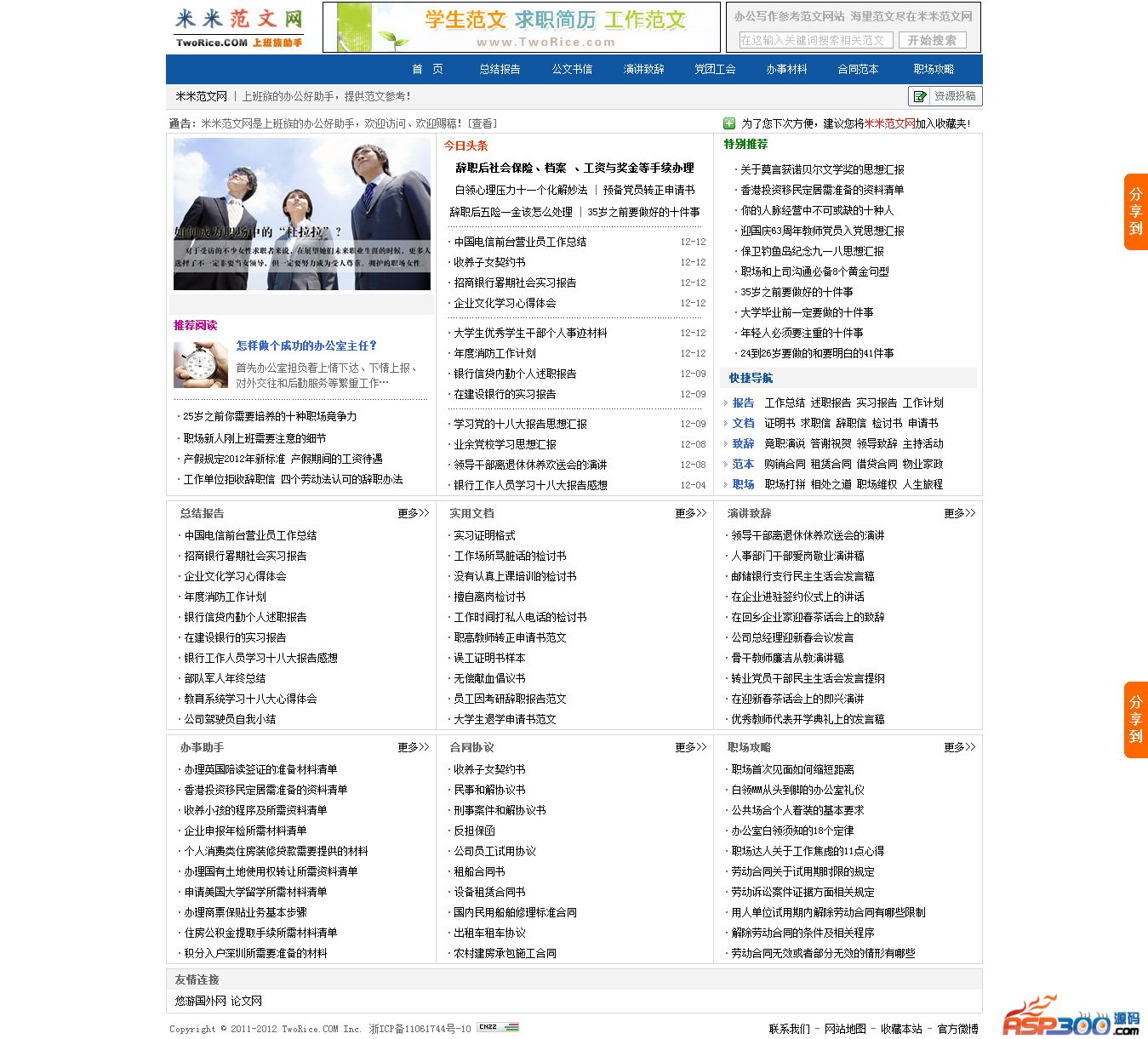 米米范文网(TwoRice.com)是一家以提供应用文范文、教案、试题等实用性资料为主的网站。本程序简单,适合二次开发,可以作为一个文章、新闻、小说等类型的网站。后台可进行文章管理与添加,分类管理与添加等,操作简单,非常适合新手使用。
