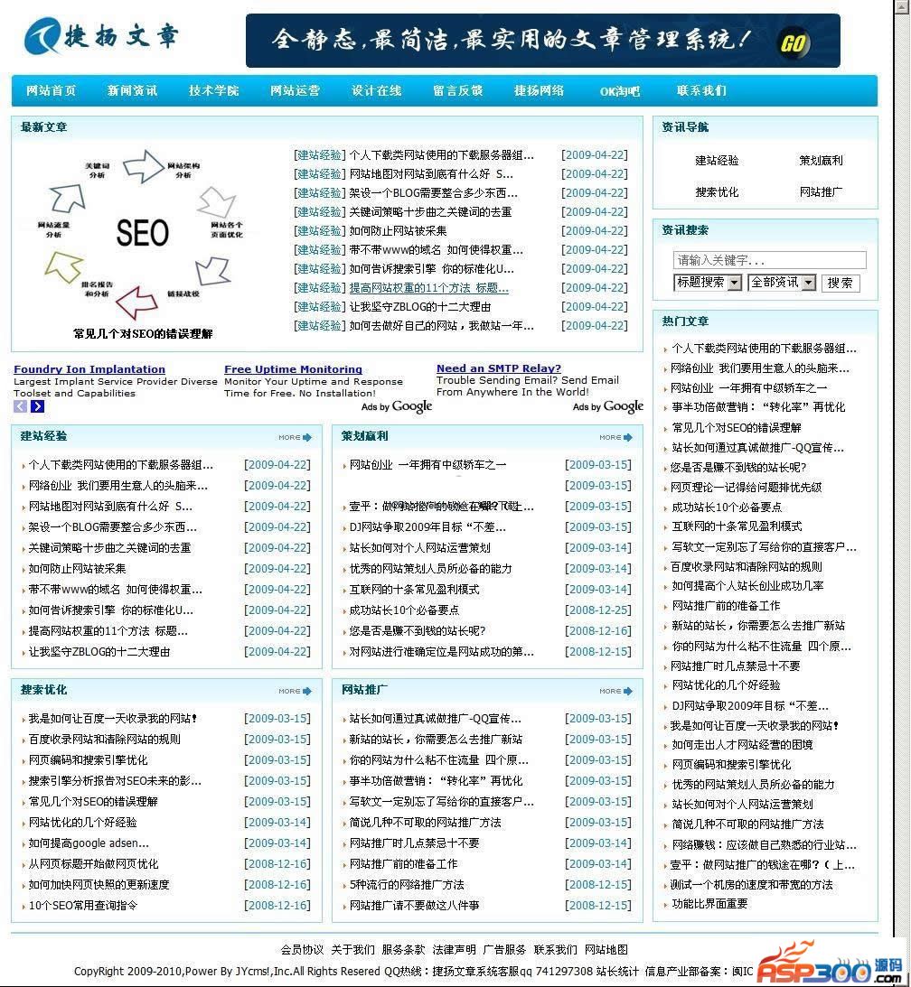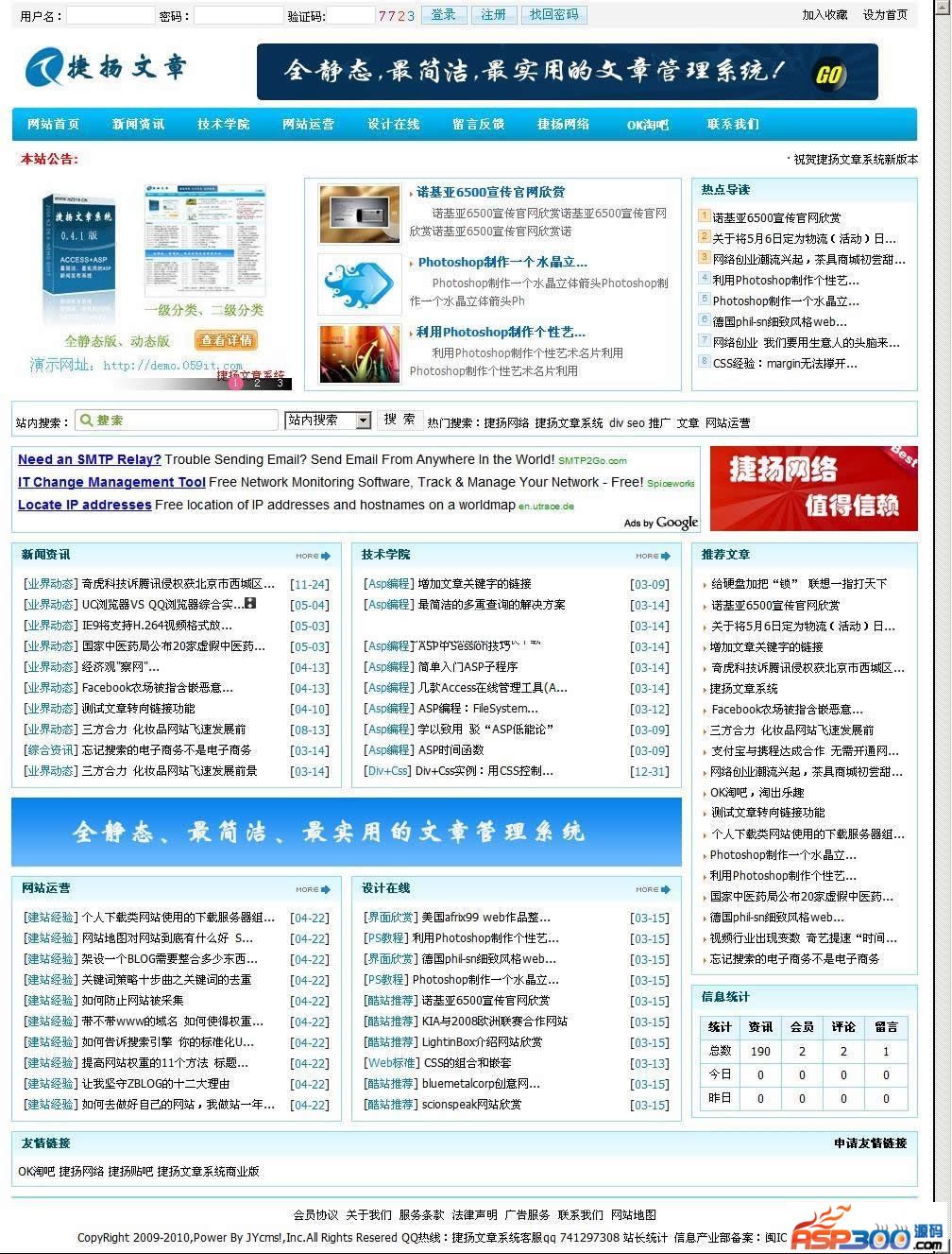 JYCMS(捷扬文章管理系统)是在Asp+Access/Mssql环境下开发的开源产品。JYCMS以信息为主题,通过以文字和图片标题为起点,以无限栏目分类为支撑,以达到信息门户的远景!JYCMS设计了全新的模板引擎,用户可以通过标签的自由组合,实现更丰富多彩的页面效果。JYCMS以安全第一为原则,解决了ASP程序的常见漏洞问题。程序自身无任何后门,严格的代码过滤为网站的安全运行提供了可靠的保障。捷扬文章系统后台功能模块:系统设置:网站信息设置 网站公告管理 网站广告管理 友情链接管理 网站留言管理 网站评论管理 文章心情管理 关键词管理 文章作者管理 文章来源管理会员管理:系统会员管理 会员等级管理 管理员管理频道管理:系统频道设置 文章频道管理 会员文章管理 回收站管理 文章Tags管理 敏感词管理 通用页面管理模板风格:模板方案管理 网站模板管理 风格样式管理 通用标签管理数据维护:备份数据库 恢复数据库 压缩数据库 执行sql语句 系统空间占用文件管理:Html文件生成 Html文件管理 上传文件生成插件管理:文章采集管理 生成SiteMaps 外部调用设置 HTML转JS代码 Js转HTML代码 调查投票管理 在线监测木马 充值卡充值管理系统相关:清除系统缓存 后台日志管理 前台日志管理免费版2.8.30到3.3.1版本升级内容: