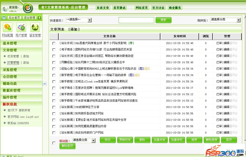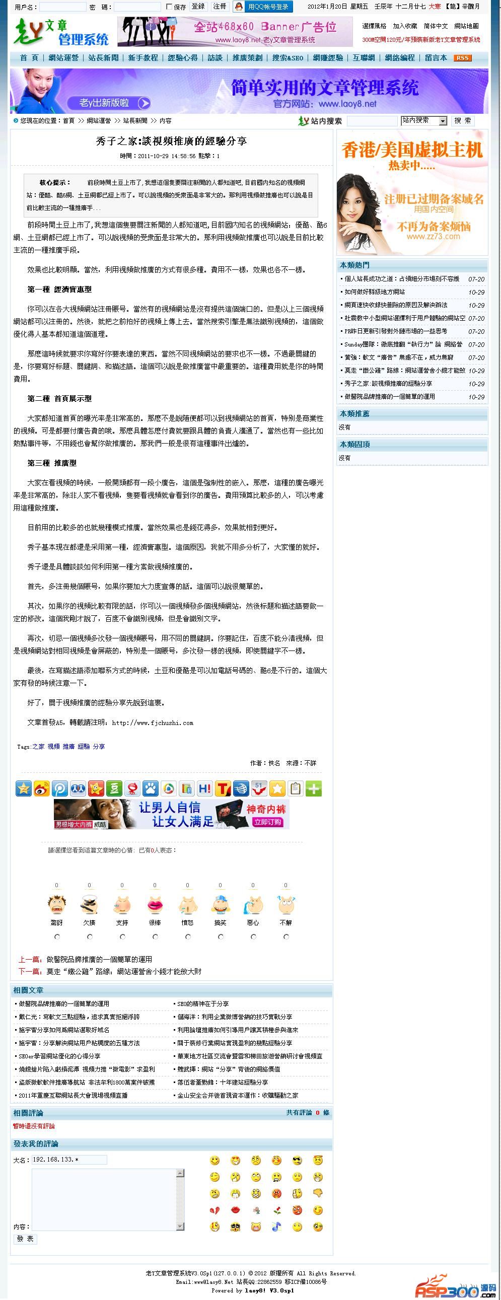 本网程序是根据老Y修改而来,感谢老Y文章系统的支持!本程序是在老Y3.0sp1的基础上加上一些板块然后通过完整的数据组合而成,页面布局清晰美观,板块齐全,适合个人类新闻站点的开设。 老y文章管理系统,采用Asp+Access开发,适应中小新闻文章型网站及个人网站需求,整个网站采用Div+Css布局,IE6、IE7、IE8、Firefox、Chrome下测试无误.程序说明:如果放在根目录,不需要修改任何东西即可运行放在根目录,不用任何修改即可正常运行;如果放在虚拟目录,请打开inc/config.asp修改SitePath="/目录名/"请确保你的空间支持FSO及AspJpeg组件,否则可能有些功能无法使用默认后台管理路径admin/admin_login.asp,用户名admin密码admin1357安全设置[重要]:inc/config.asp中修改数据库名称和后台目录,并在Data目录下将数据库以及Admin目录重命名登陆后台后请马上修改管理员用户名及密码v1.5sp1版更新和修正了:1、美化了整个页面布局。2、简化了源码大小,去处所有图片文件。3、增加了论坛栏目。4、修正了QQ登陆数据。5、修正了首页缩略图,上传文章可以自动生成。6、如果网站出现白页可以在风格管理中选择更新所有CSS。7、网站论坛在栏目修改论坛指向链接即可。本网程序是根据老Y修改而来,感谢老Y文章系统的支持!本次更新去除了所有图片文件,减小了源码大小,能更有利于网站的优化与改版,并且加入了论坛栏目有利于站内交流活跃人气。如有技术疑问可以联系QQ1754326269