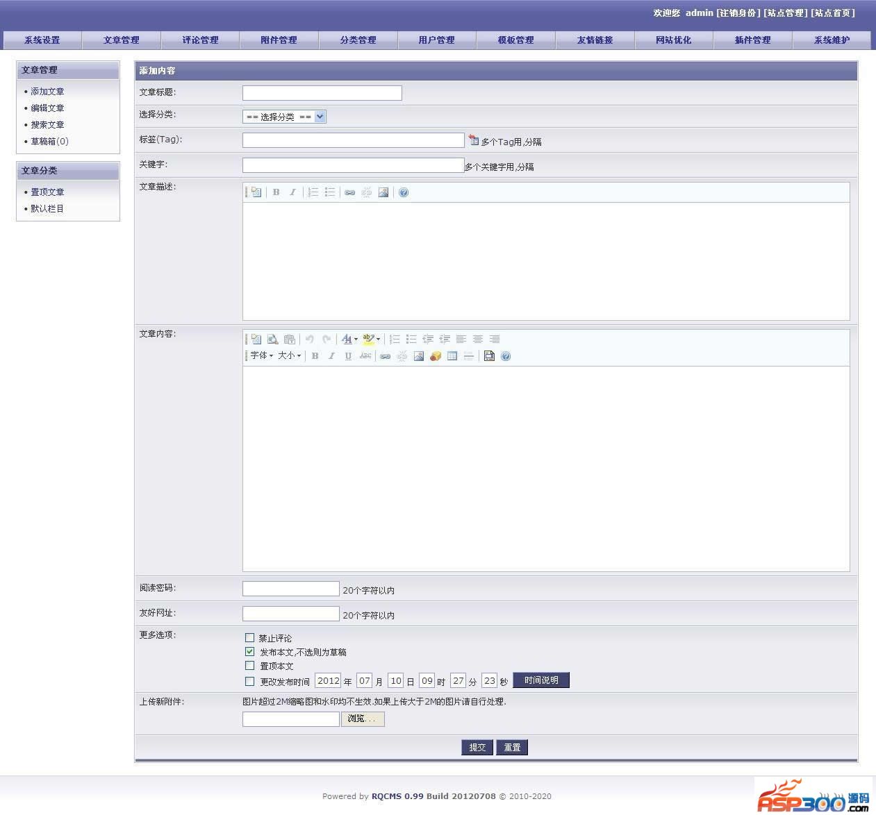 系统支持每个文章和每个栏目单独指定网址和网址格式。支持动态网址和静态网址格式的自定义设置。比如可以将文章页 article.php?url=test 更改显示为 read.asp?a=test,blog/test ,book/test.html 三种样式。其中的文件后缀,文件名,都是可以自定义,从而实现了完全隐藏网站程序或伪造其它的网站程序,方便多个站点间拥有不同的个性。2.多站点