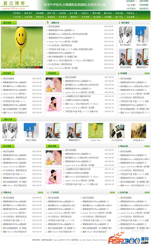 本程序是夏日php+mysql新闻管理系统,由夏日博客独立设计完成,前台页面美观,后台程序精简,整体源码结构非常简洁,可以进行后台独立管理。本程序旨在帮助php新手用户进行研究学习使用,现最新版本为 v1.2,满足基本新闻系统的要求,所拥有新闻最基本的功能 :1,网站全局的设置 2,新闻无限分类增删改查 3,新闻系统的管理 4,内容页生成静态页面(批量及分段生成)。 5,单独管理系统单页。本程序源码完全开源免费,程序你可以进行随意修改使用,但如果要进行商业用途,出现的一切后果由使用者负责!使用说明:手动配置mysql数据库文件 include/config.php,导入根目录下phphtml.sql数据库。后台管理:你的网址/新闻系统目录/admin/AdminLogin.php 用户名:admin,密码:admin,正常使用时建议更改后台登陆地址。