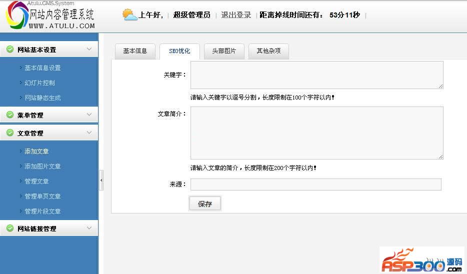 阿土鲁cms网站管理系统采用asp.net3.5编写,数据库使用的sqlite,不需要购买数据库的cms,适合建站网站使用,新闻主页使用。阿土鲁网站管理系统拥有以下特点。1,采用。net+sqlite框架编写,便于维护,使用。2,程序拥有静态生成功能,生成后网站打开速度更快。3,自主的后台管理,用户完全可以通过简单的方式来管理网站。4,采用标签模板式静态生成,模板随时可以改变,可以生成各种想要的风格网站。