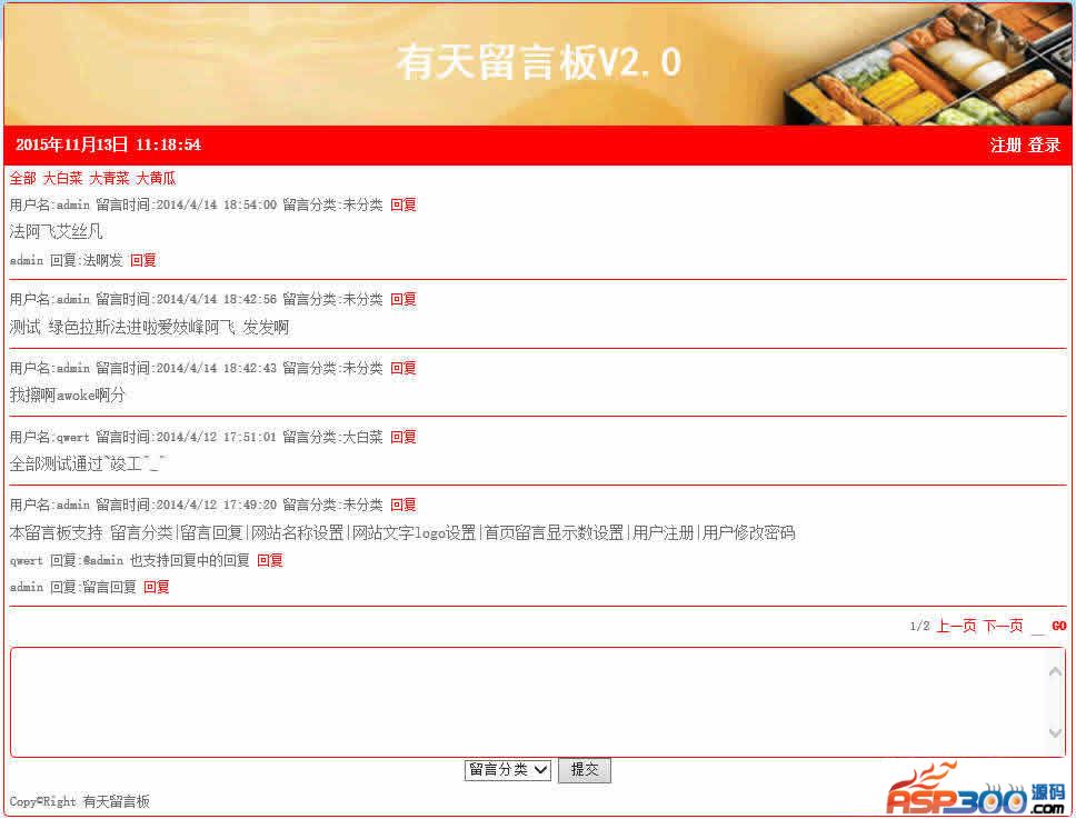 有天ASP留言板是一款简洁的ASP留言板系统,支持页面头部和底部自定义HTML。功能:1.支持分类留言2.留言回复3.回复也支持回复4.首页显示留言条数可设置5.可自定义网站名称与文字LOGO
