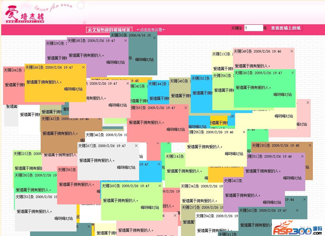 非常精巧美观许愿墙完整源代码 ASP版+带后台管理 后台地址admin.asp 后台管理用户 admin 密码:admin ID:57913 声明:本站所有资源均来源于互联网收集,仅供学习参考使用,如若本站内容侵犯了原著者的合法权益,可联系我们进行处理。