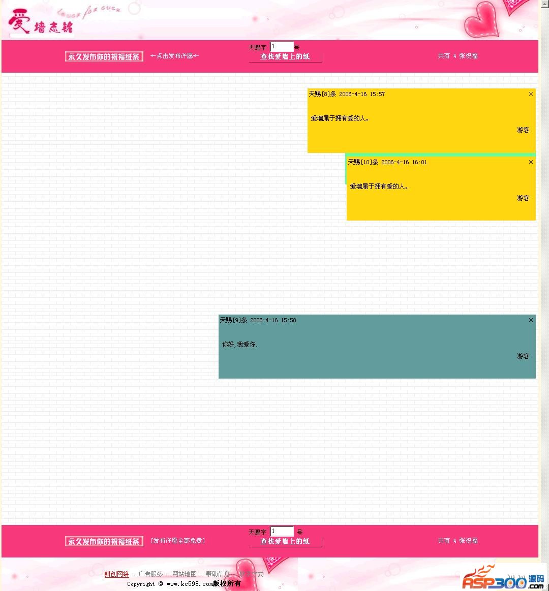 互联网免费许愿墙ASP开发完成。 后台地址admin.asp 后台管理用户 admin 密码:admin ID:50589 声明:本站所有资源均来源于互联网收集,仅供学习参考使用,如若本站内容侵犯了原著者的合法权益,可联系我们进行处理。