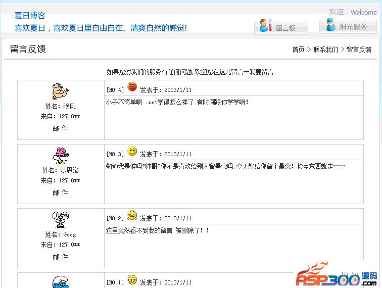 夏日博客精简美观的ASP留言板,基于ASP+ACCESS架构,本留言本源码简单,结构小巧,有独立的后台管理,可以在线进行回复,防SQL注入,可以很好的整合到个人或者企业网站当中,经过反复检查,暂没有发出问题,如果大家在使用中遇到任何问题,欢迎反馈!为了安全,大家在安装后,请务必将lyb_date目录和lyb_date目录下的数据库进行更名,同时将数据库连接文件根目录下的xrconn.asp里面数据库路径进行更改,以及admin文件夹下conn.asp路径进行更改。本留言板简单轻巧,实用美观,便于嵌入网站的留言本,这个留言本不用进行安装,直接打开包里的ASP运行环境Appser.exe即可进行浏览,适合ASP新手使用研究。留言本的后台管理:admin/login.asp