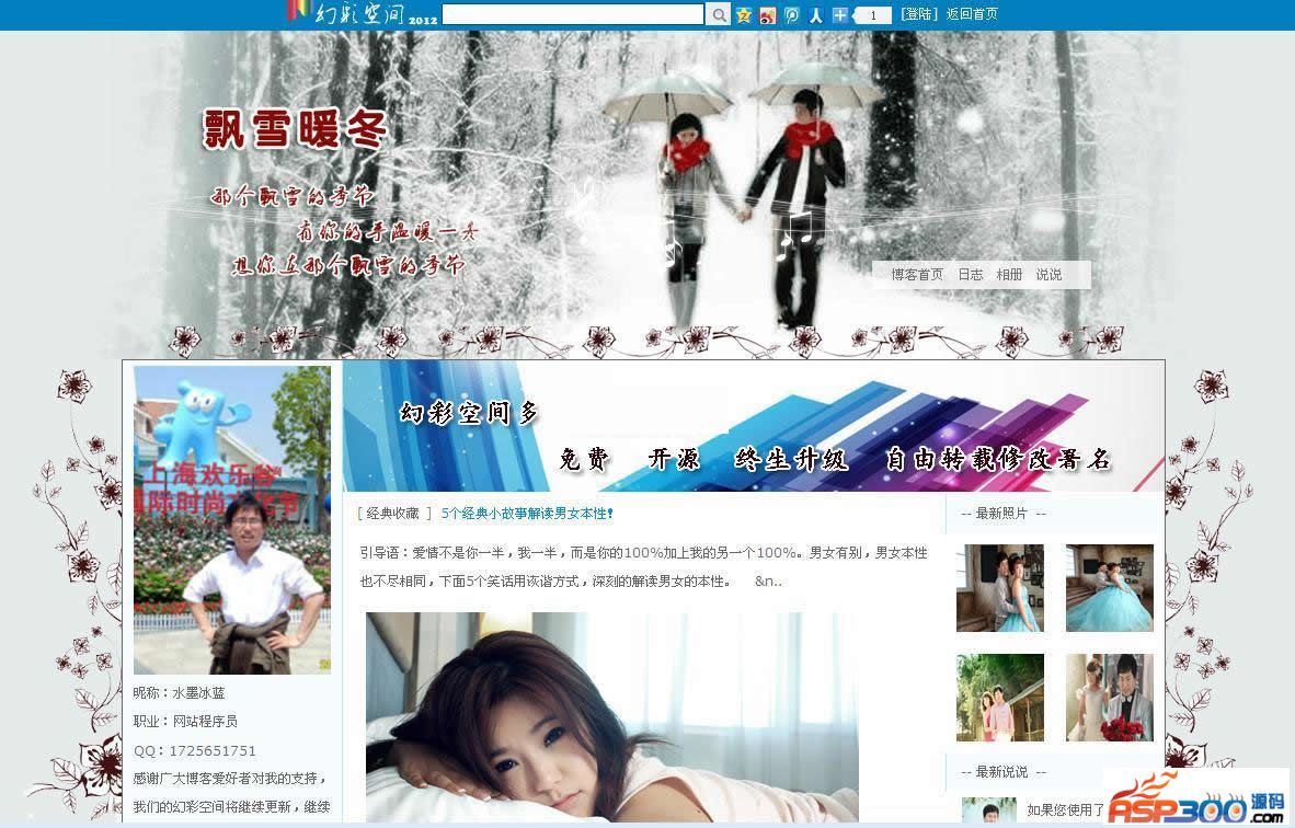 很多人都想拥有自己的博客,但苦于不会开发,又不舍得花钱购买,想从网上下载个不花钱的,不是功能不全就是风格不满意,要是购买个博客再加上空间域名费用将近千元,前一段时间我也从网上找过仿QQ空间这样的博客,找了很多都是过时的,不美观,好不容易找到一个却要花钱,哎,对于我一个穷酸的人来说哪舍得啊,怎么办?!不能让他们他欺负人了,所以利用自己现有的技术开发一个仿QQ空间的博客,我要没费,要开源,要把我的劳动成果分享给大家,做人不能只看钱,由于本人技术有限只能开发一个个人版简单的博客,我非常想有人给我指点一下,把这个博客做的更完善,变成多用户版的。希望喜欢asp+access+Dreamweaver的同志们加入我的行列,打造小成本低能耗的个人博客。