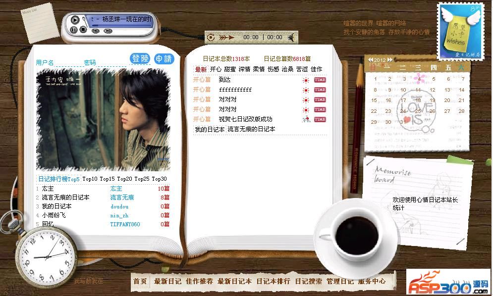 4、用户日记首页留言本与个人形象为动态JS特效,简单而动感。