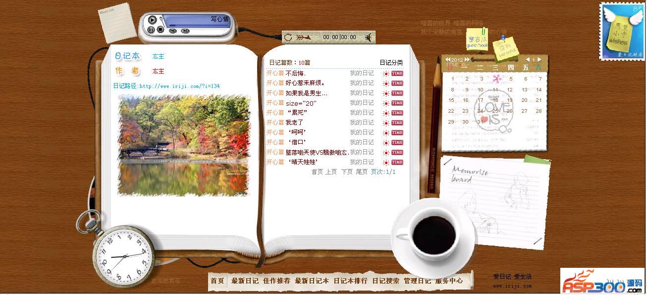 爱日记多用户网络日记本是一个小巧精致的网络日记本,它界面美观、功能丰富、使用方便,包含了用户登录注册、日记本排行、日记搜索、日记管理、留言评论等功能,还有音乐播放、时钟日历、愿望小寺等小功能。