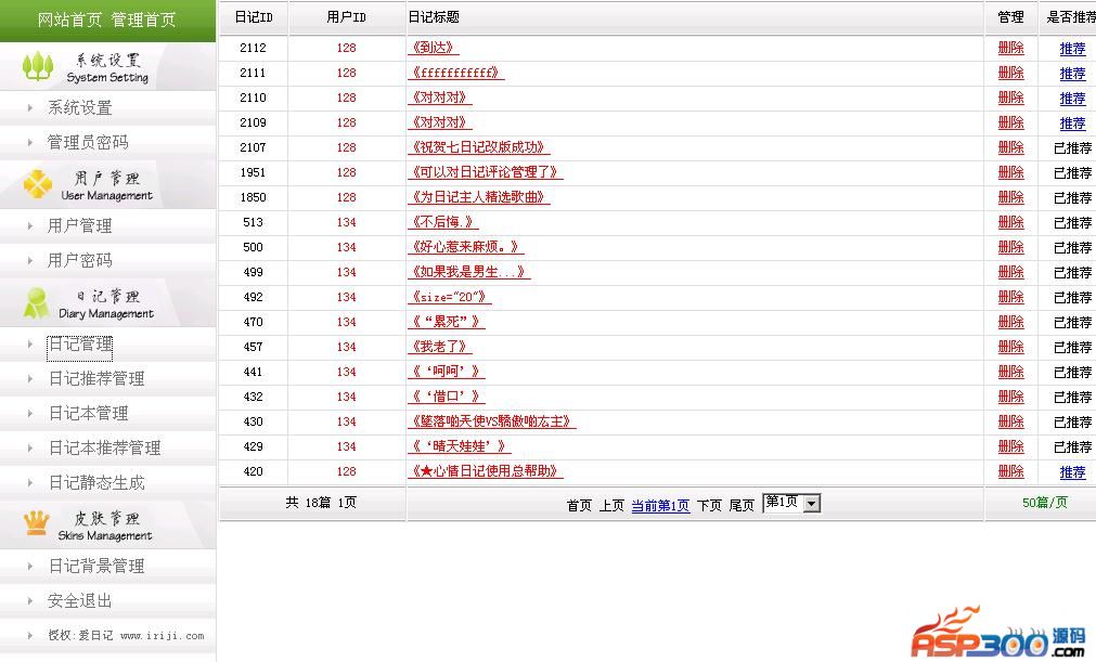 10、日记后台管理分系统设置、管理员密码、用户管理、用户密码、日记管理和推荐管理几大块。