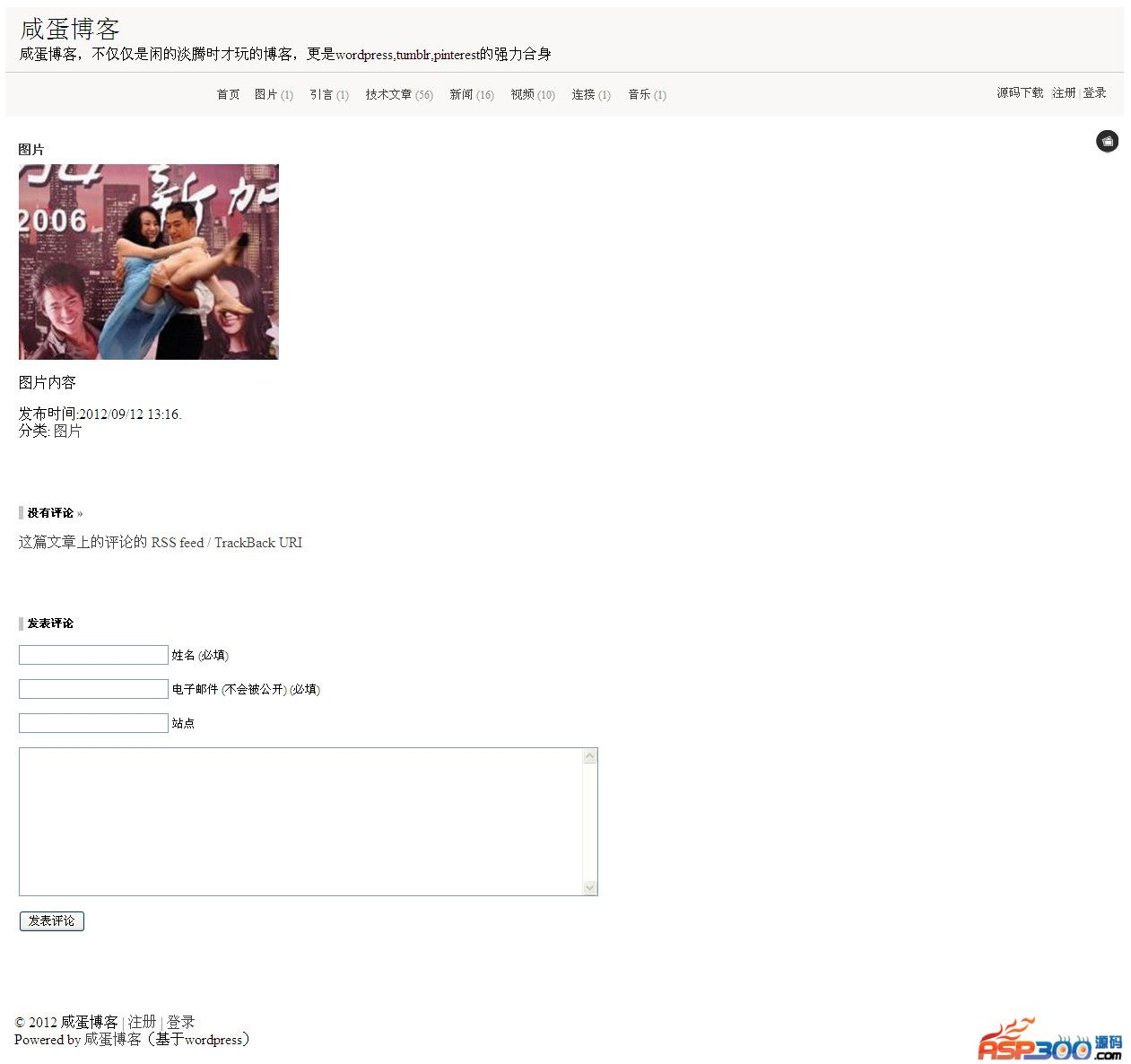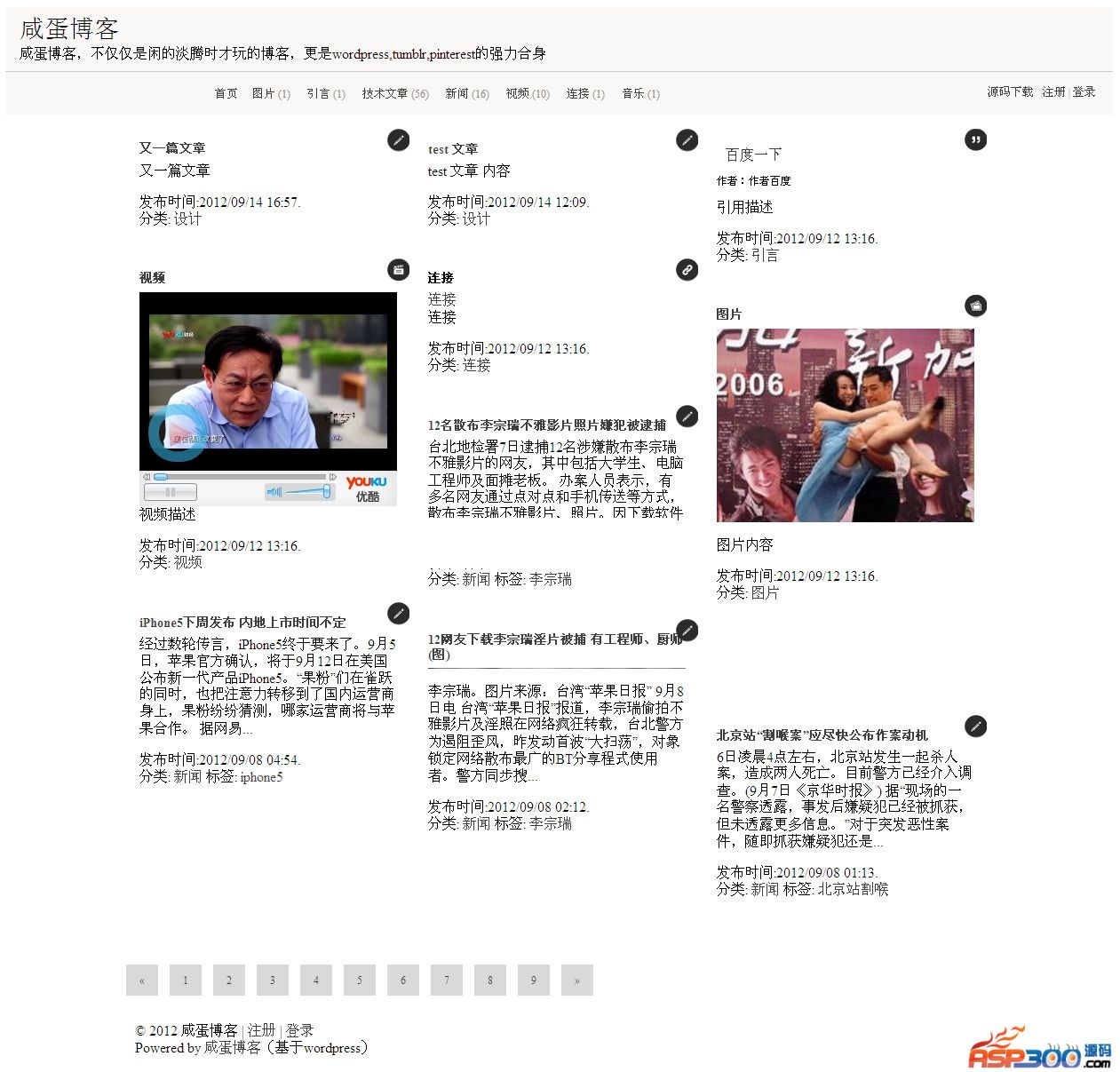 咸蛋博客是基于WordPress3.3.2开发的开源个人信息发布平台,是wordpress,tumblr,pinterest三合一的开源博客特点:1:基于wordpress3.3.2,可以使用wordpress已有的所有插件,模块,继承了wordpress所有的优点2:可以把现有博客数据快速导入咸蛋博客,把自己的博客快速变成流行的轻博客3:6种文章形式,日志,图片,音乐,视频,引言,链接,一个完整的轻博客系统。4:默认使用瀑布流式布局,拥有自己的pinterest系统。5:更多其它特点等待您的发现