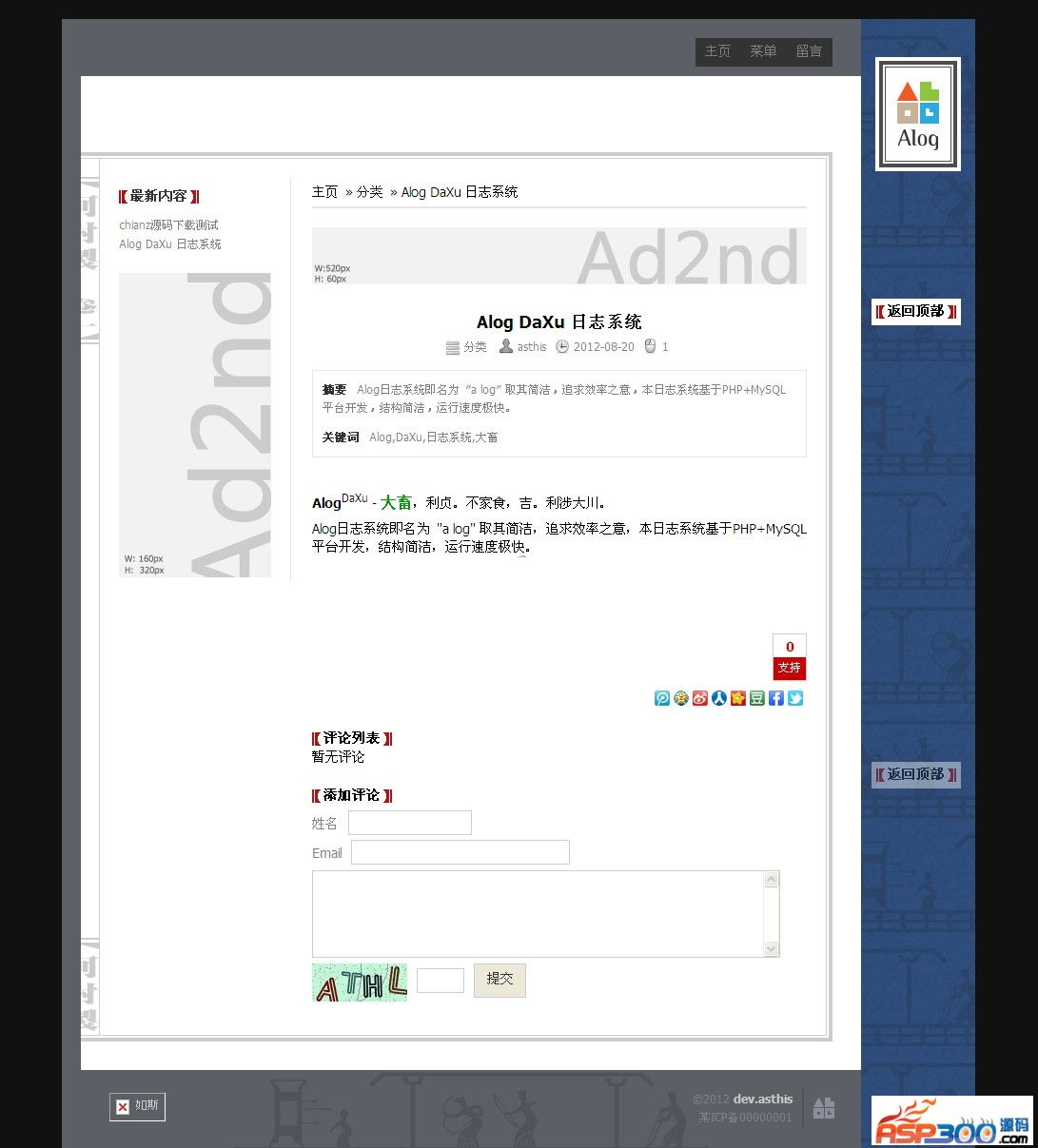 Alog DaXu版为独立扩展版,代码结构全面改写,界面、功能及效率均有较大提升。日志系统名为 "a log" 取其简洁,追求效率之意,本日志系统基于PHP+MySQL平台开发,结构简洁,运行速度极快。信息反馈: http://any.asthis.net/board/3/安装方法系统要求:PHP5.2+, MySQL 5.0+1. 将upload下所有的文件上传至网站根目录。2. 通过浏览器访问,填写配置信息进行安装。3. 安装完成,访问首页。4. 删除 install 目录。5. 管理目录 admin,可更改目录名以增加网站安全性。