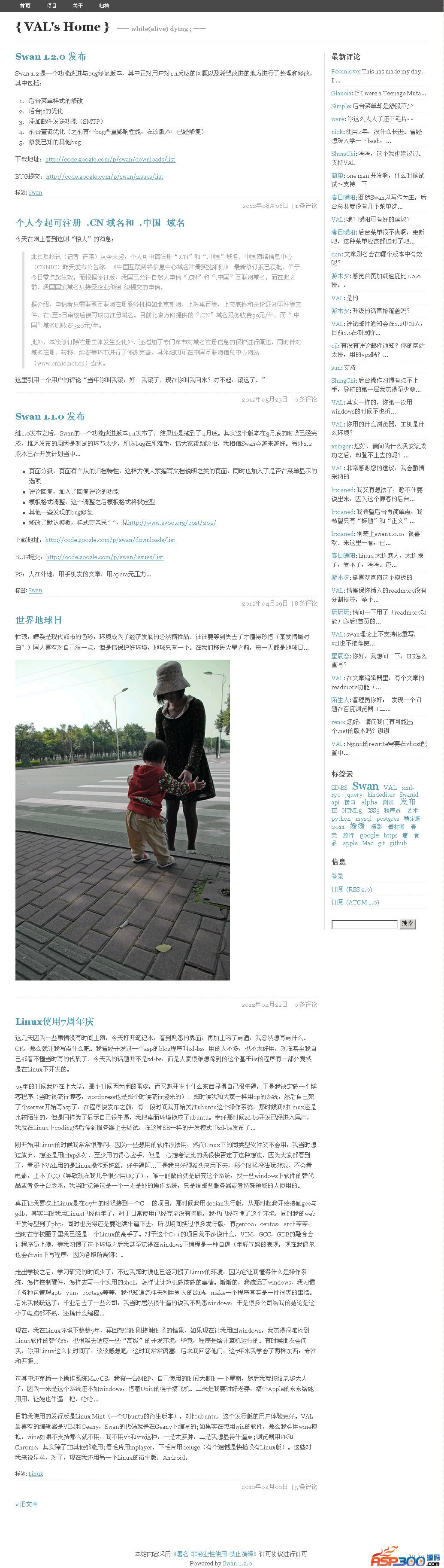 Swan是一个基于PHP和MySql的个人文章发布/管理平台,她由svoo社区维护,致力于操作性、易用性、美观度以及安全性,她同时也在向着艺术性努力。Swan基于 《GPL协议》 开源协议,大家可以免费的下载、使用、传播和修改。Swan经过了一个非常漫长的beta期(其实是VAL没空更新),现在大家终于能用上正式版了。这个版本并没有加入新功能,是对beta版本功能的完善以及程序结构的调整。其中也精简了部分功能,比如SwanId等等。Swan 1.2 是一个功能改进与bug修复版本,其中正对用户对1.1反应的问题以及希望改进的地方进行了整理和修改,其中包括:后台菜单样式的修改