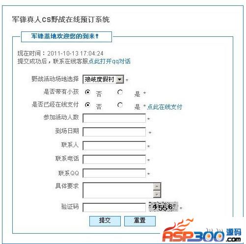 当前程序为军锋真人CS野战在线预订系统使用PHP+MYSQL开发制作,具备基本的在线订单功能。通过管理后台可以查看和管理订单记录。
