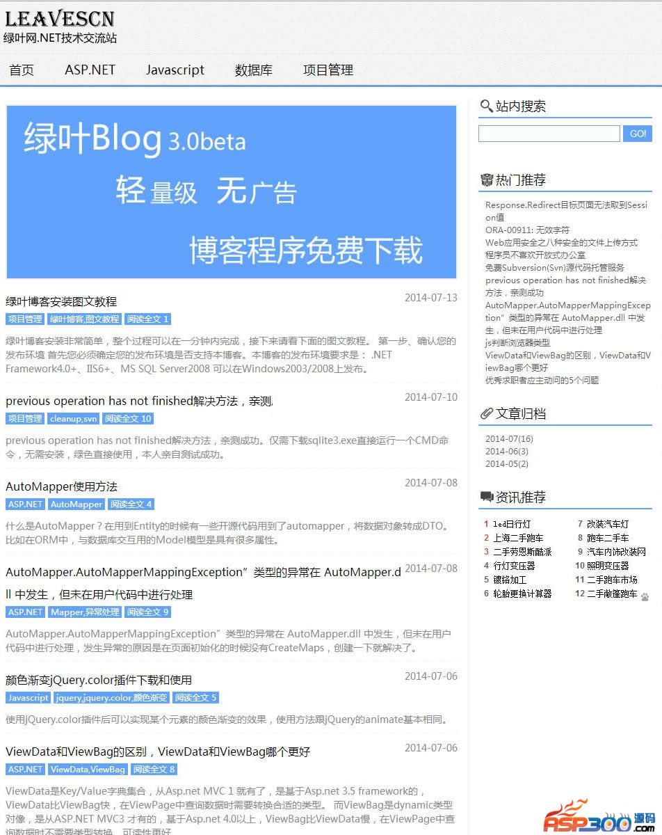 Paul\’s Blog已更名为绿叶博客。绿叶博客使用C#语言编写,合理使用缓存机制,部分页面生成静态,采用div布局符合web2.0标准,注重SEO优化,风格简约,安装方便,适合个人发布内容。程序包含了博客系统的最基本功能,包括一些营销功能,如轮播图,广告代码等模块(部分模块在beta版本尚未开放),整站大小仅为3.69M,让您的网站更轻更快!博客采用Wordpress经典两栏风格,样式简约明快,博客功能齐全。使用Entity Framework框架开发,对SQL注入等安全漏洞做过测试,确保程序的安全可靠性。绿叶博客基于.NET Framework4.0开发,使用MSSQL数据库。建议使用SQL2005+。