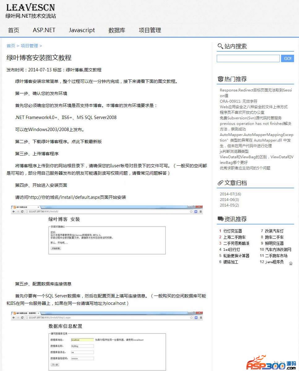 全新安装过程:1、将网站程序上传至服务器2、访问http://你的IP/install/Default.aspx3、根据安装提示填写网站配置,直至安装完成。4、后台地址http://你的IP/Manage/Login.aspx任何问题请查看http://www.leavescn.com查看图文攻略。本版为beta版,版更更新情况请关注官网或chinaz,持续更新中,谢谢关注。绿叶博客系统 v3.1 增加功能:热门标签搜索功能,免登陆评论功能,优化安装流程。