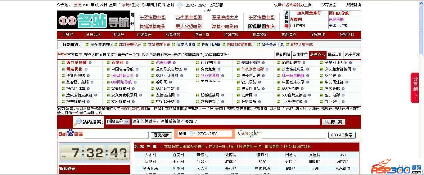 网址导航源码程序最大特点是本系统改变了以往网址站一成不变的模式,采用谁对我站贡献大,我站也给予他最大的宣传和展示的机会;只要您在本系统注册登记您的网址,然后在你网站做好我站连接,只要平常连接即可,每次从您网站有用户到我站,那么你的网站将在最近入站以及你网站所在分类的第一位置!连接双方公正平等。