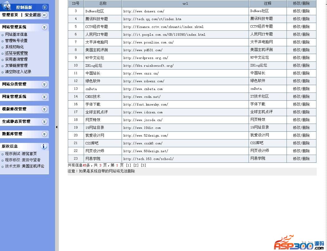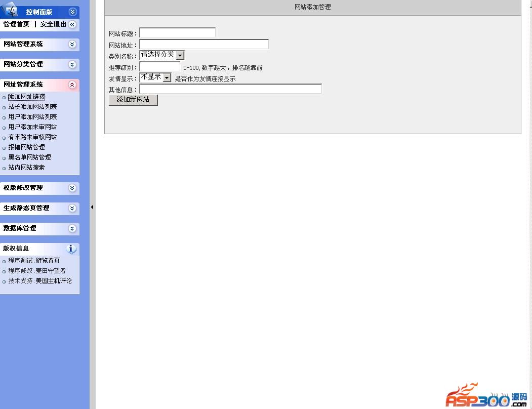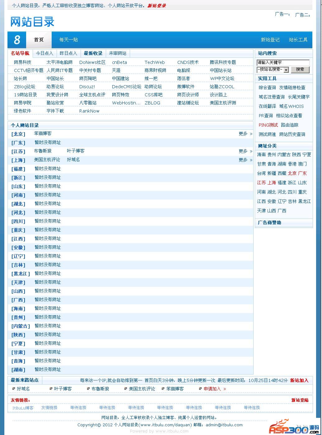 个人网站目录(V1.0),内核来自卢松松的博客大全源码。鉴于一个朋友让我给他修改、精简以及提高一定的用户体验制作一个个人网站目录程序,我就在源码基础上加以修改。经过3天的修改,基本上在原来的程序上有一定的改变。