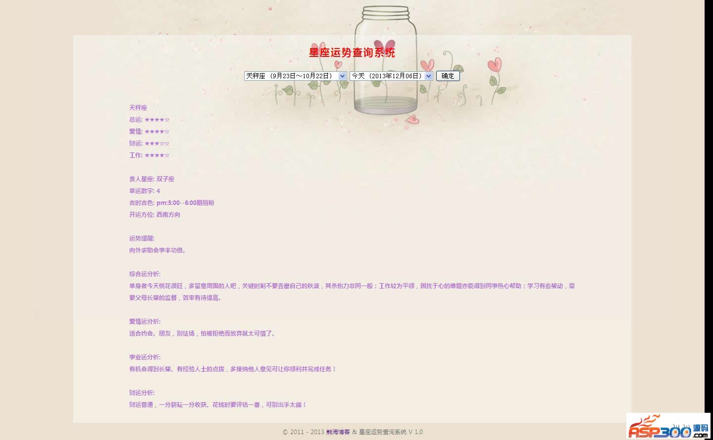 星座查询系统是一款用来查询星座运行的php查询软件。无聊时间写了一个十二星座查询运势的系统,本系统可获取今天、明天、本周、本月的运势,本系统简洁无数据库,数据源来自搜狐星座频道。需要星座这个功能的朋友可以自由使用。 ID:49616 声明:本站所有资源均来源于互联网收集,仅供学习参考使用,如若本站内容侵犯了原著者的合法权益,可联系我们进行处理。