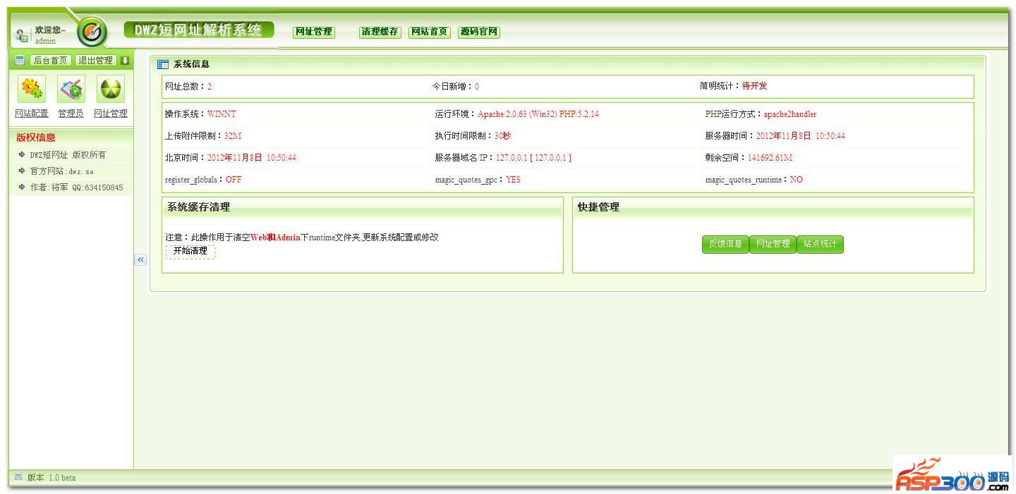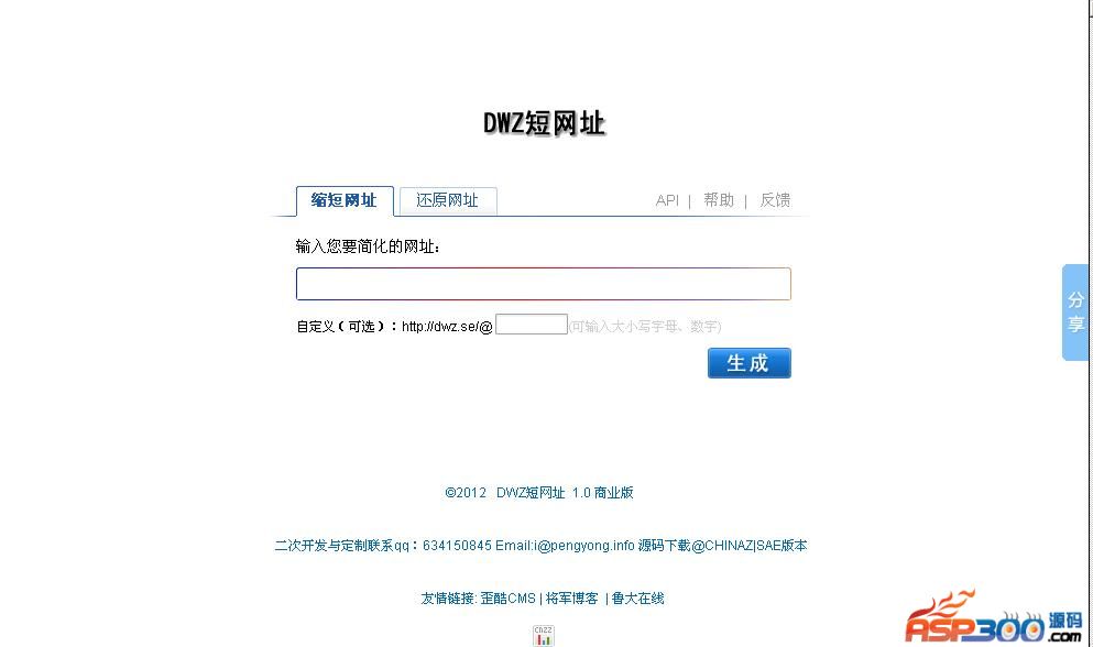DWZ短网址是是一款PHP语言下的开源解析软件 ,提供用户进行网址缩短、网址还原、网址加密等功能,并提供一套管理后台,方便管理员进行管理。 ID:44185 声明:本站所有资源均来源于互联网收集,仅供学习参考使用,如若本站内容侵犯了原著者的合法权益,可联系我们进行处理。