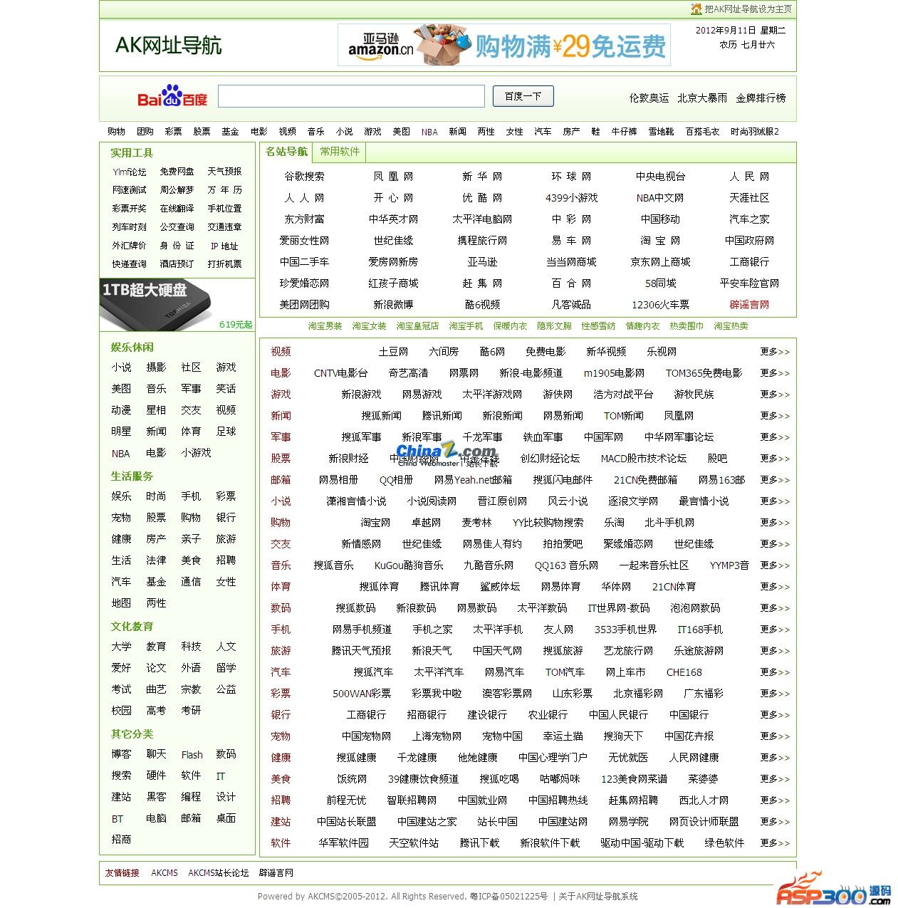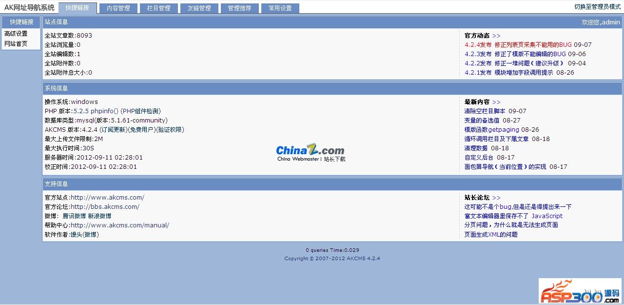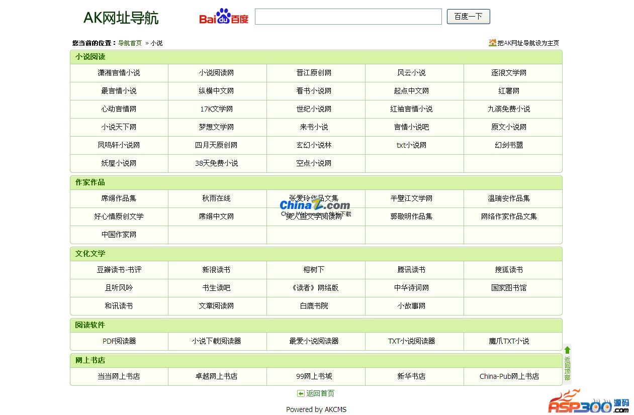AKCMS网址导航系统是一款内容丰富但又小巧灵活的软件,AKCMS网址导航系统基于AKCMS底层核心,运行速度快,安全可靠。AKCMS网址导航系统收录的网址将近10000条,囊括了生活服务休闲娱乐等方面的网址。本系统管理方便,后台简单操作容易。本系统是一个成型的产品,功能健全,普通用户基本上不需要进行修改,是一款安装即用的系统。