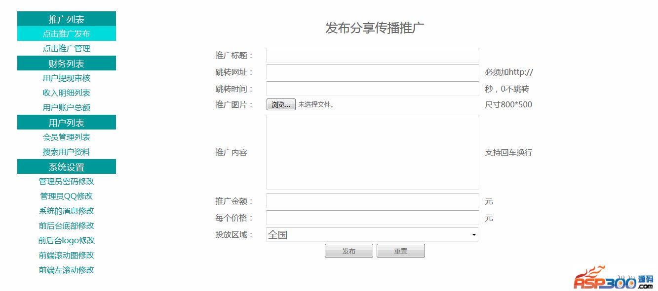诗龙分享传播推广系统是一款智能推广系统,可使用一键分享方法,复制网址链接方法,进行推广,本系统适用于推广淘宝商店,网站,电子商务等等,如今百度竞价,搜狗竞价等,高额的费用超低的转化率,已经不适合中小型企业和个人,本系统具有推广费用低,全人工智能推广自动计费,多重防作弊等功能,可设定本站页面的图文发布推广,也可设定倒计时进行跳转到设定的淘宝店,网站等等,是中小型企业和个人的首选推广产品。二 管理员后台使用说明:1.点击左侧的点击推广发布。1)写入要推广文章的标题,2)跳转的网址(既要跳转到要推广的网站或者淘宝),如果没有个人网站或者淘宝商店等,跳转可设定为0,既不跳转任何网站,在本页面进行推广,如果有个人网站或者淘宝商店等,跳转时间为不能设置太短(建议不少于8秒),否则会员无法复制推广链接(既浏览器的地址)或者直接点击底部悬浮一键分享操作。3)上传图片。4)输入推广文章内容。5)输入推广金额,推广金额是本条文章的推广总价。6)输入每个金额(既点击ip的单价),最低ip单价可以设置0.01元,推广金额除以每个ip的价格就是这个文章需要推广的个数,发布完(可点击推广管理的查看预览效果)。