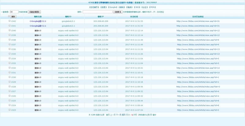 更新日志:20170907版本:程序版本新增加了一键清理功能。可以根据输入的天数来清理爬行记录数据库。最新版本优化了秒写数据库方式,并增加了对URL搜索的支持,同时扩大了模糊搜索范围。蜘蛛名称、蜘蛛ID、蜘蛛IP、访问页面均支持模糊搜索。记录入库方法更改为秒入库方法。增加了页面执行时间毫秒显示。去掉了下拉式选项,因为条数过多会导致这个下拉选页方式特别耗页面执行时间。增加了自动识别当前文件名,可以随意更改botlog.asp的文件名而不会导致翻页失效。日后我们会推出全新的2.0升级版。并且依旧免费提供。2.0版本即将可以自定义设置BOT名称和BOTID,自定义系统相关设置,并且将采用亿条数据极速秒翻页方案,同时也将界面UI全面改版。关注我们官方网站,敬请期待。