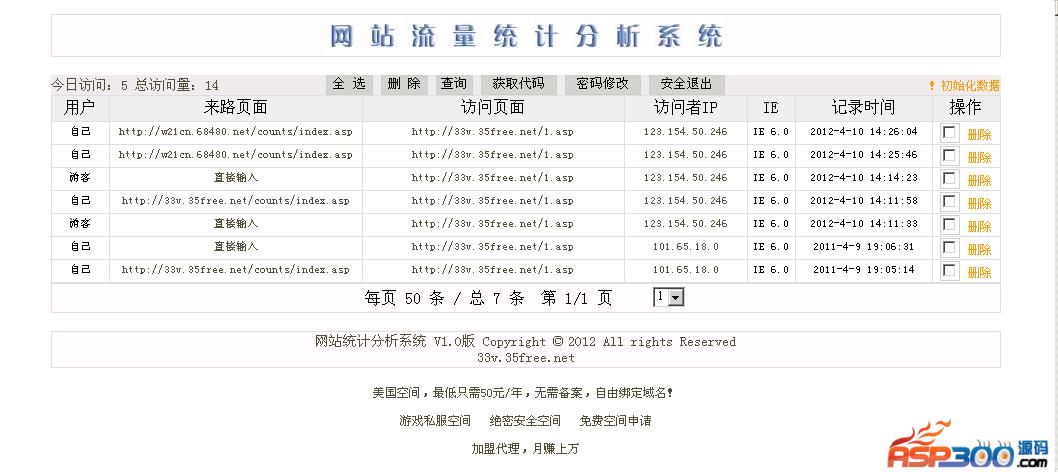2,来路页面统计,访问页面统计,访问IP统计,IE统计,整体浏览统计
