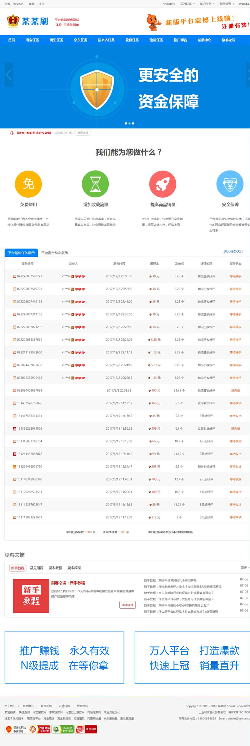 2、系统主要由淘宝任务、天猫任务、京东任务、阿里任务、拼多多任务、收藏任务、流量任务、快递单生成与查询系统、信用评价系统、会员系统、文章系统、广告系统、推广系统等20多个功能模块组成。