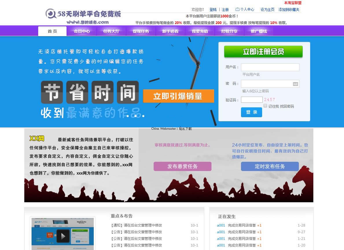 58天淘宝刷单系统是一款专门为商家打造爆款,买家赚取佣金的平台程序。免费版提供了完整的正常下单交易系统。谷得网第一个版本,左左网第一个版本均由此系统基础进行开发。较谷得网第一个版本进行了大量升级,程序提供了发布任务,发布提现、任务内容可视化编辑、任务内容重新编辑功能、附加智能化后台管理、会员双任务发布模式、VIP会员功能、签收验证、VIP服务通道、小号认证要求、小号信誉要求、任务自动按时发布功能、提现任务模块、官方提现功能、会员推广链接、推广提成功能、自定义推广提成参数、发布任务冻结金币保障、平台设置手续费功能等诸多功能。