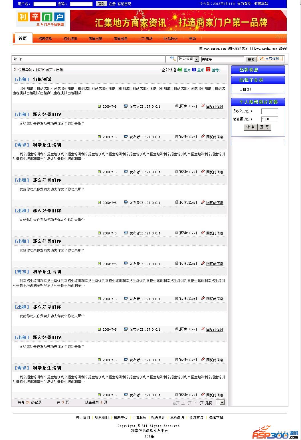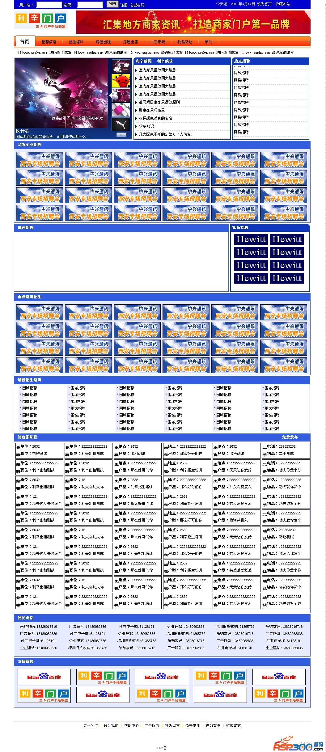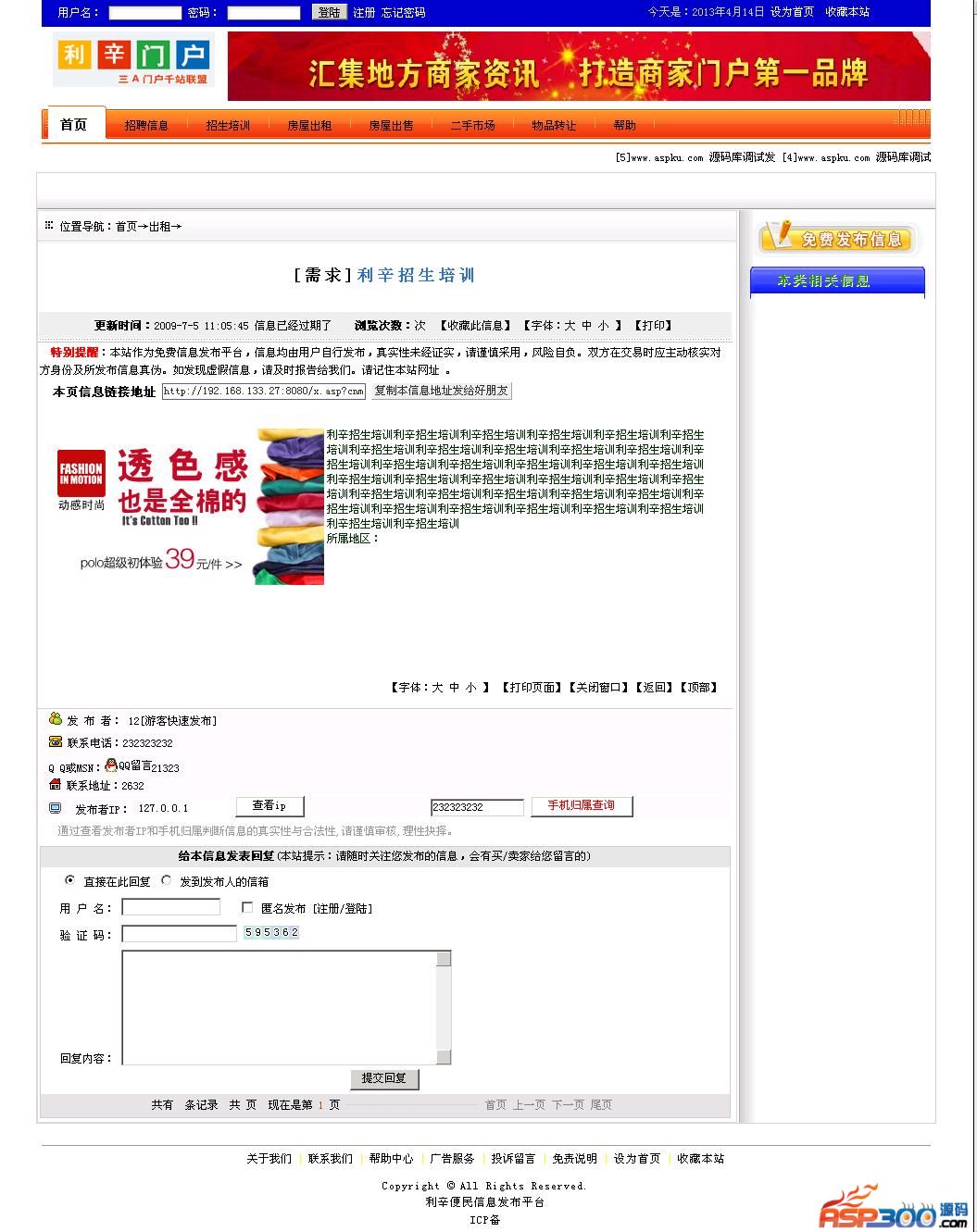 利辛便民信息发布平台网站源码,程序还不错!后台地址:admin用户名和密码:admin