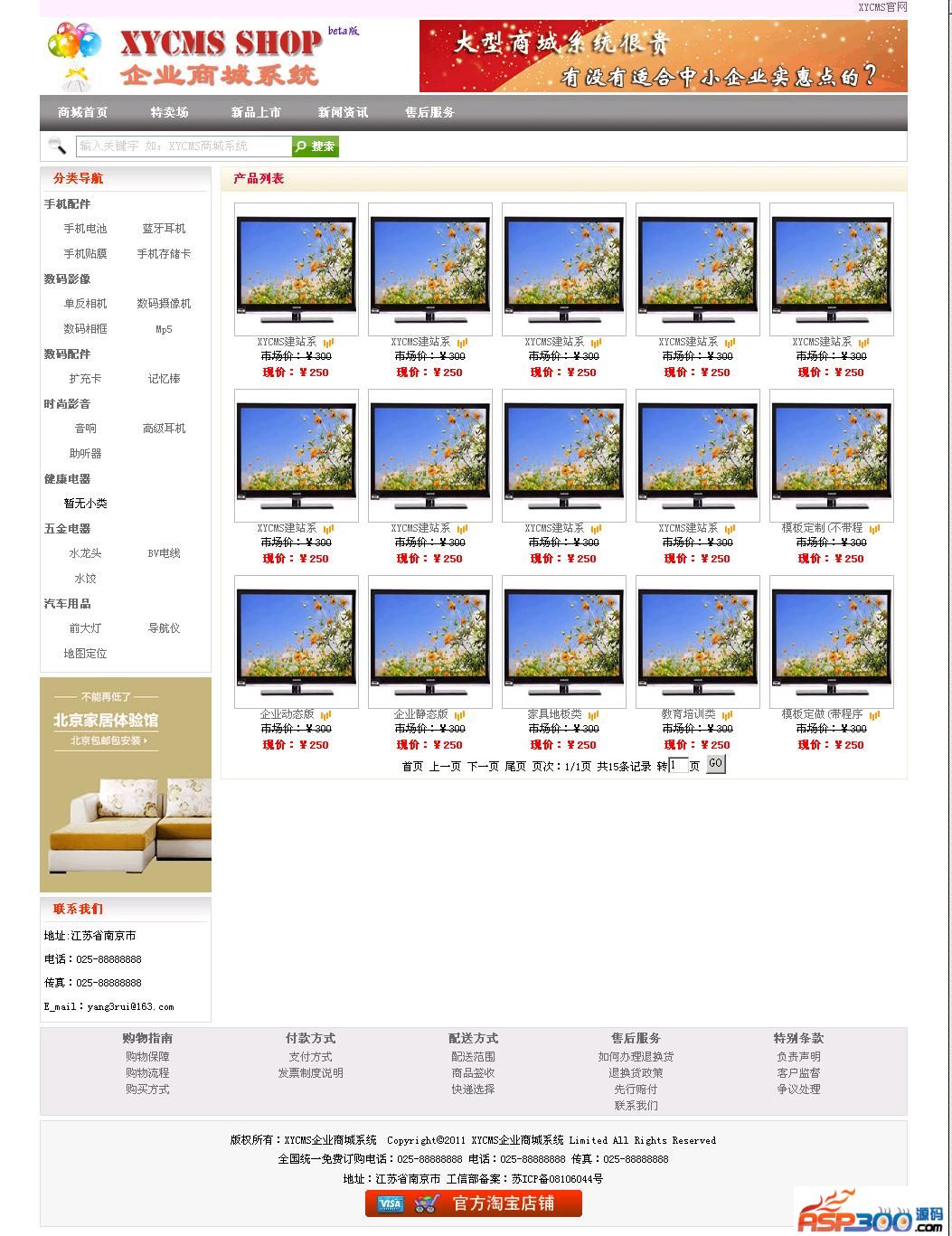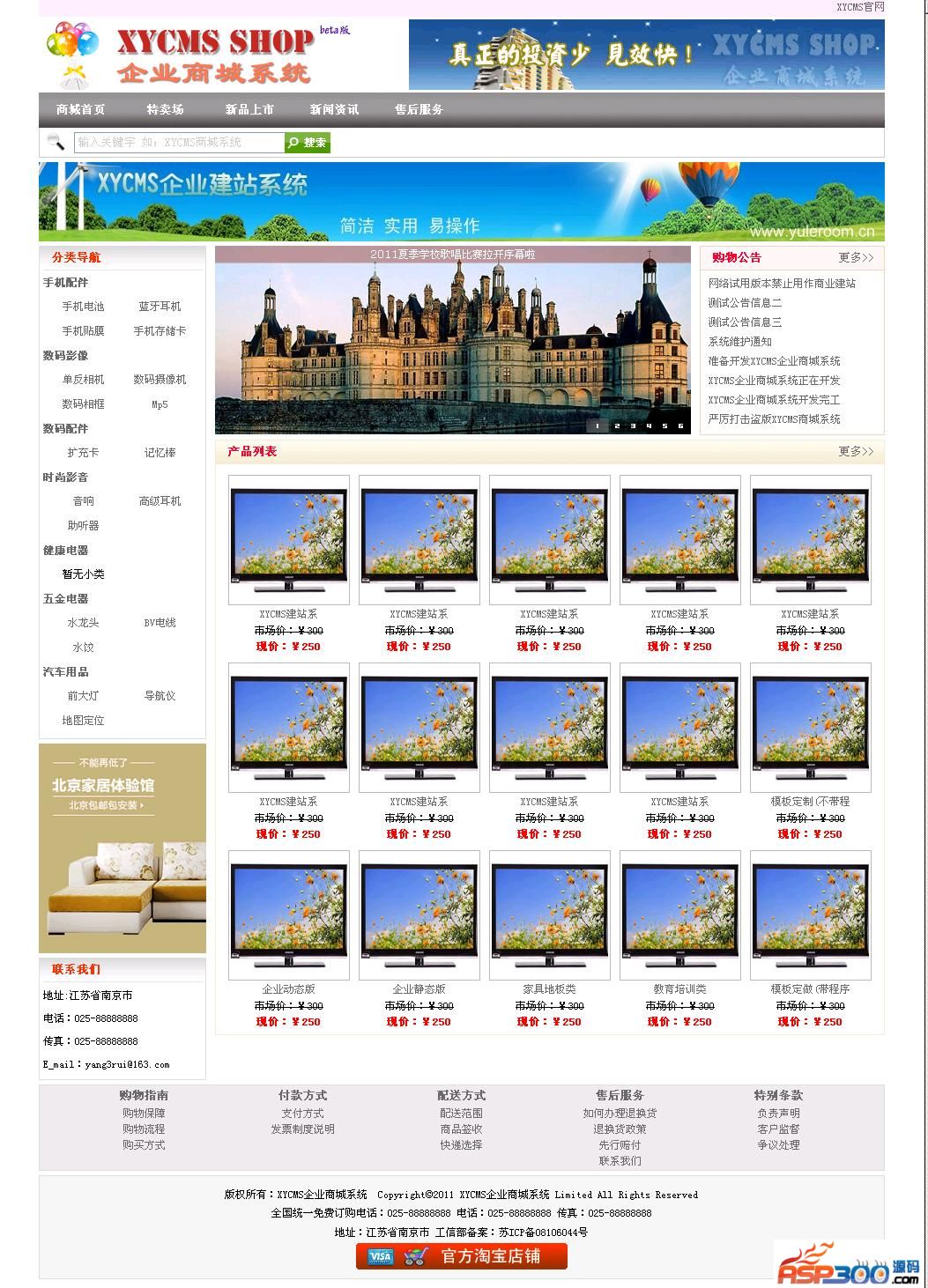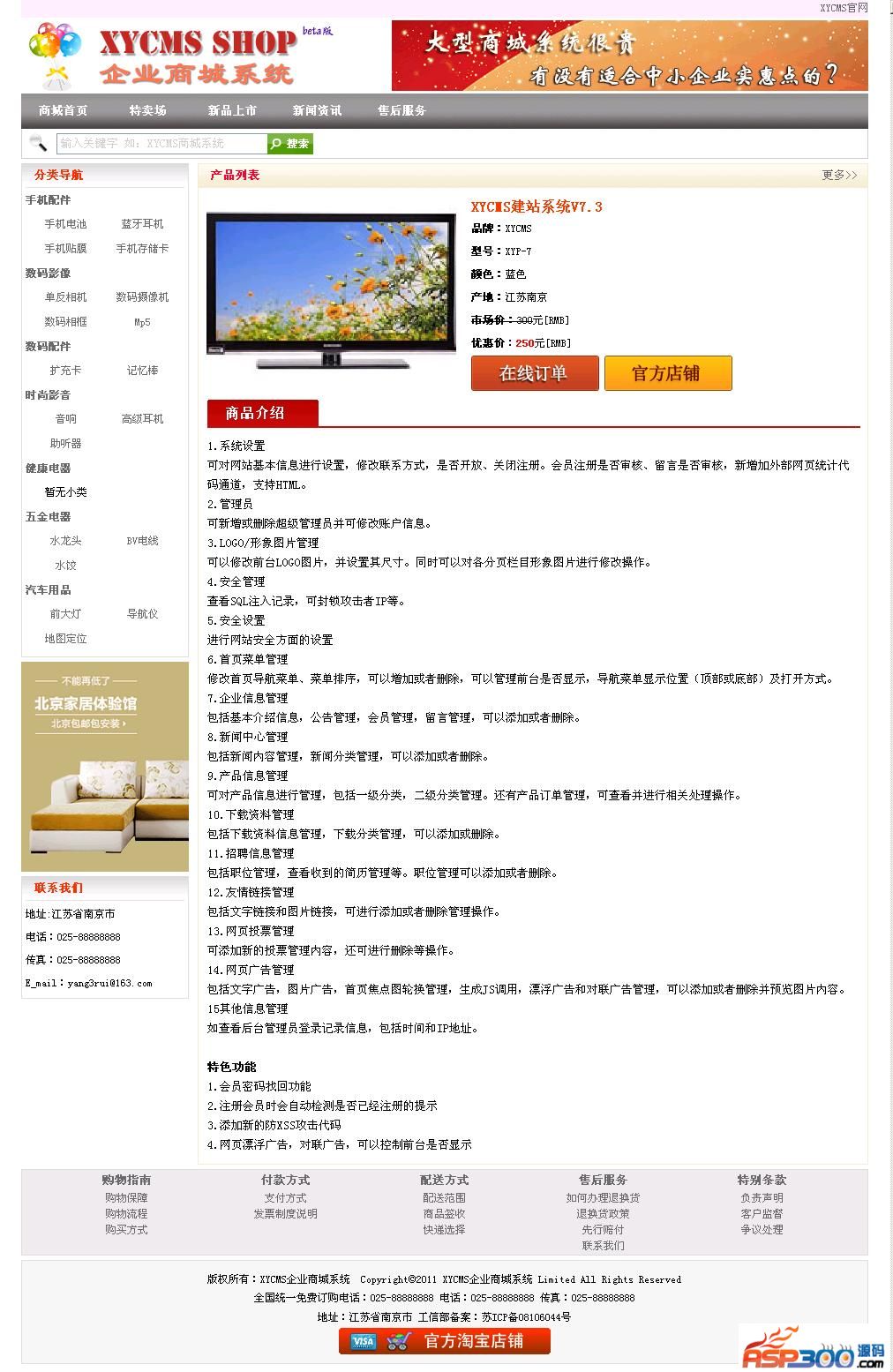 XYCMS企业商城系统是一款小型的商城系统。程序作者:XY联系方式:E-mail:yang3rui@163.com QQ: 364500483该源码使用用途:ASP爱好者学习或者研究,禁止用作商业建站。网站后台路径:/admin;用户名,密码:adminv2.1功能说明:1.管理员管理:对超级管理员信息管理,可以进行添加,删除,修改等操作2.商城公告管理。后台可进行添加,修改,删除等操作3.新闻动态管理,后台可进行添加,修改,删除等操作4.商城商品管理,后台可进行添加,修改,删除等操作5.订单管理,用户可以在线下订单,网站管理员后台查看交有关部门处理6.广告系统管理,后台可以添加,修改,删除,新添加对联,漂浮广告系统7.系统设置:进行系统相关基本信息设置,如网站名称,等基本信息。可以管理是否关闭网站8.LOGO/形象图片管理:首页LOGO管理,可以设置长宽大小9.安全管理:看相关违规操作记录,查询攻击IP地址,自动封闭IP,管理SQL信息10.安全设置:根据需要设置一些安全过滤信息11.首页菜单管理:可以添加,删除菜单信息,打开窗口,是否显示,是否为头部导航或者底部导航栏