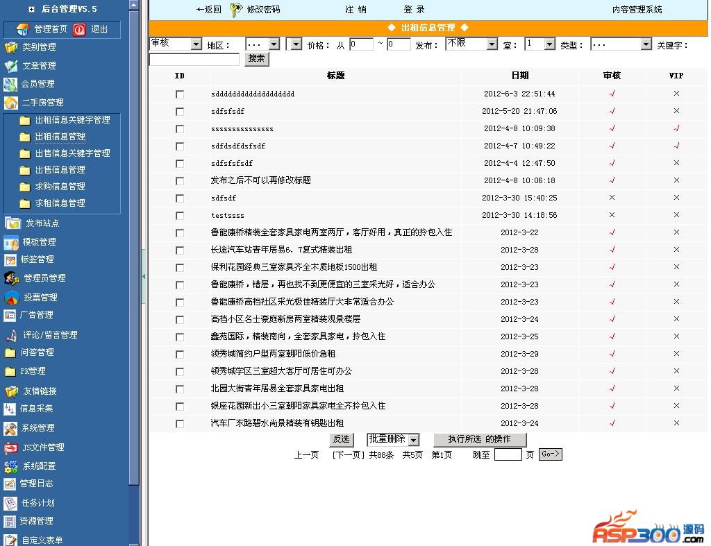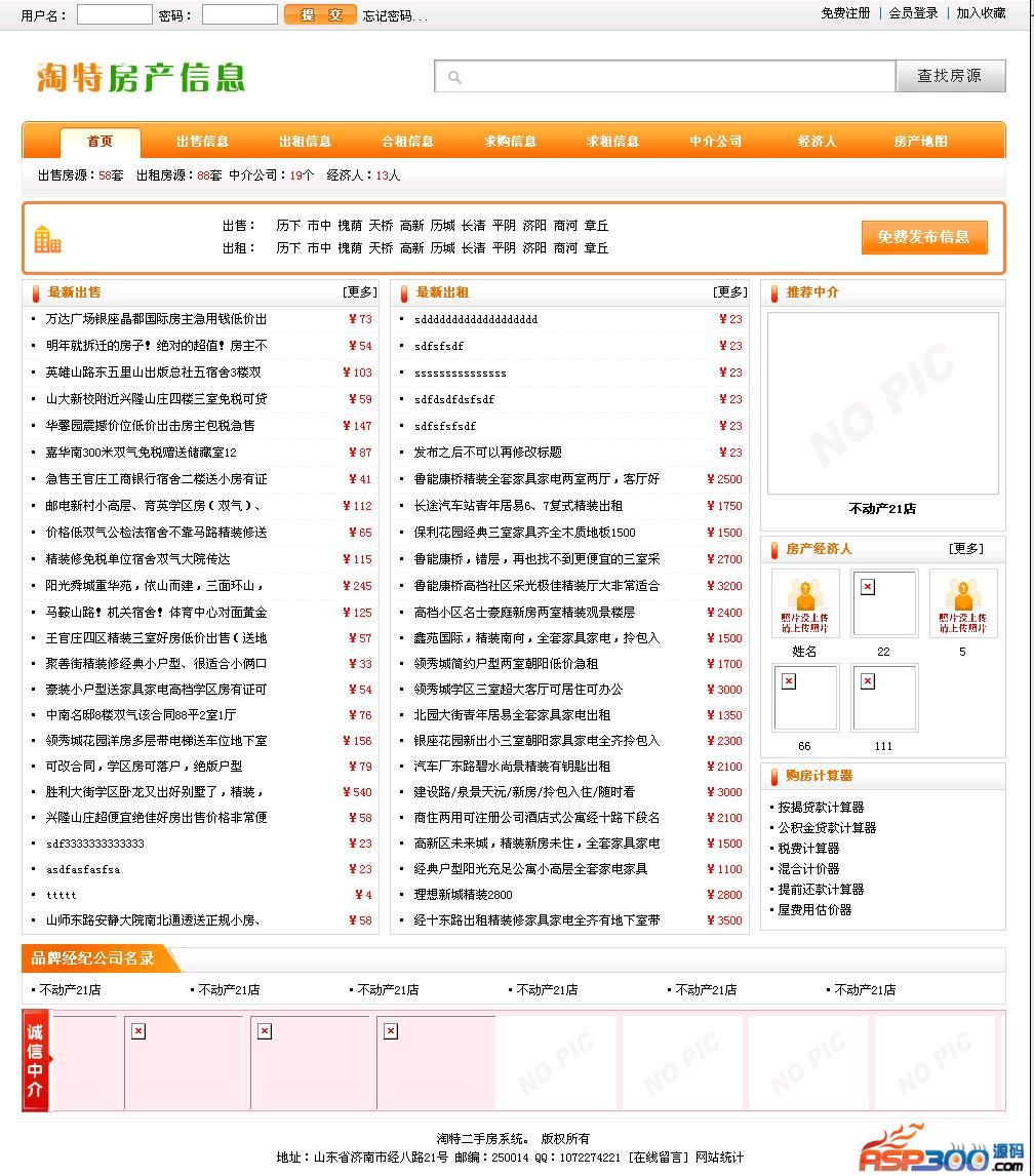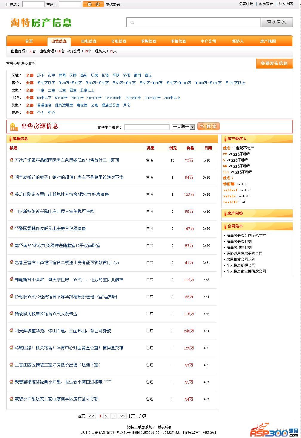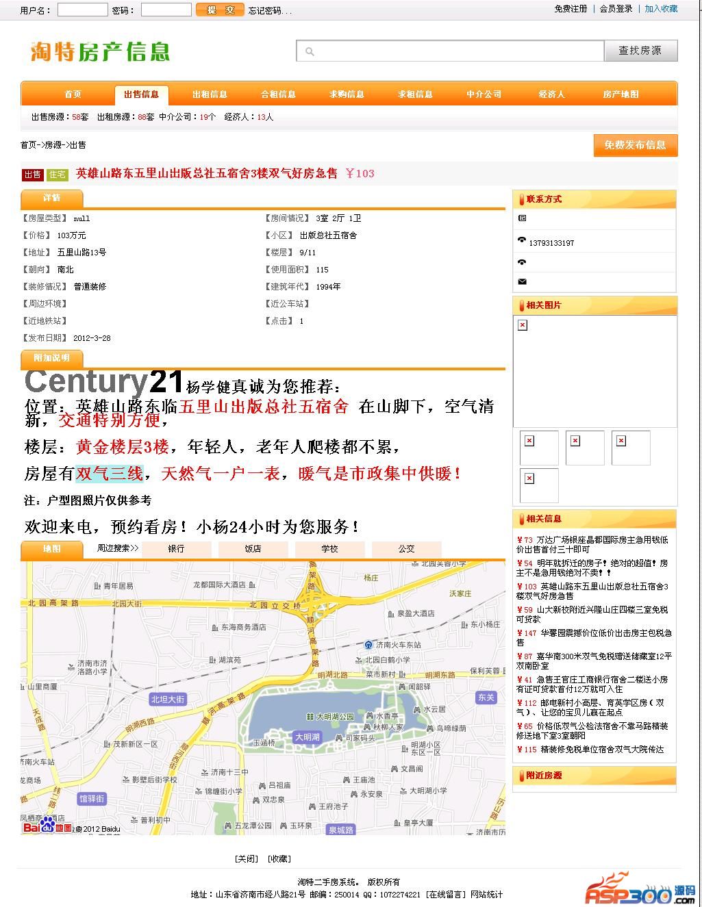 淘特二手房系统说明本系统是在淘特房产门户系统基础上,专门定制开发的一套二手房信息系统。主要提供了房屋信息出售、出租、求购、求租、合租等信息的发布平台。本系统已提供成熟的赢利模式,通过向中介会员提供发布信息平台收取会员费为网站的主要收入来源,中介会员申请开通后,可以添加经济人和管理中介公司所属的房源信息。可在线续费购买服务期(支付宝接口)。功能特色1、详细的二手房信息属性(可后台管理)2、地图检索(出售、出租、中介)支持3、中介会员模块支持4、经济人模块5、多种条件信息检索6、支持UC和Discuz,Dvbbs会员接口,实现会员通行证7、信息统计(房源数,中介、经济人数量统计)