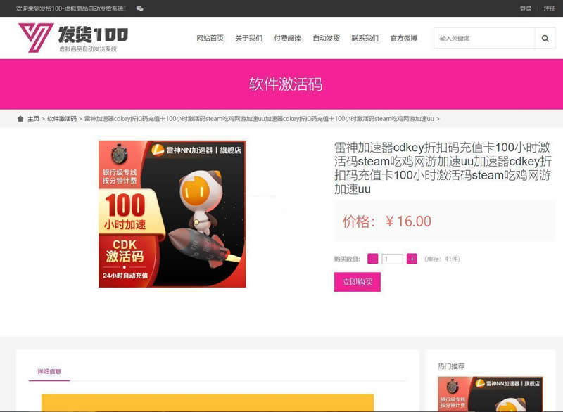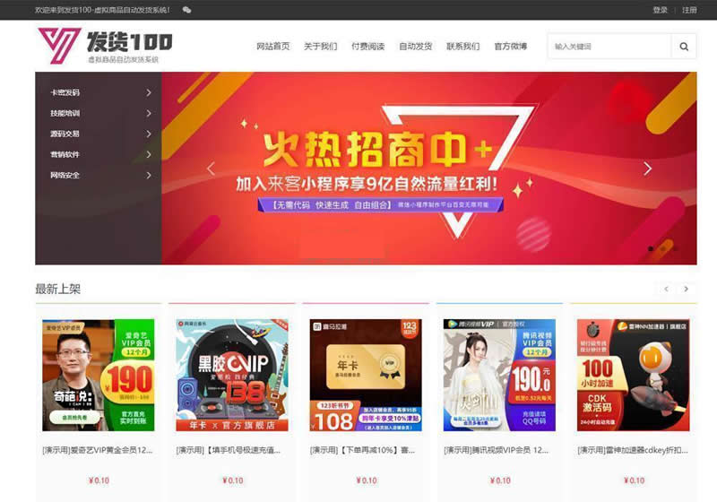发货100-虚拟商品自动发货系统是一套功能强大的虚拟商品自动发货系统/文章付费阅读系统,无需人工值守,客户在线购买即可自动完成交易。支持缺货提醒/快捷登录/回收站/免登录购买等多种功能。