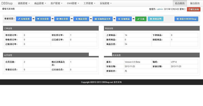 DBShop开源商城系统,使用PHP语言基于Laminas(Zendframework 3) + Doctrine 2 组合框架开发完成。可定制、多终端、多场景、多支付、多货币;严谨的安全机制,可靠稳定;方便的操作管理,节约时间;清晰的权限分配,责任分明;便捷的更新处理,一键搞定;丰富的插件市场,扩展无限。