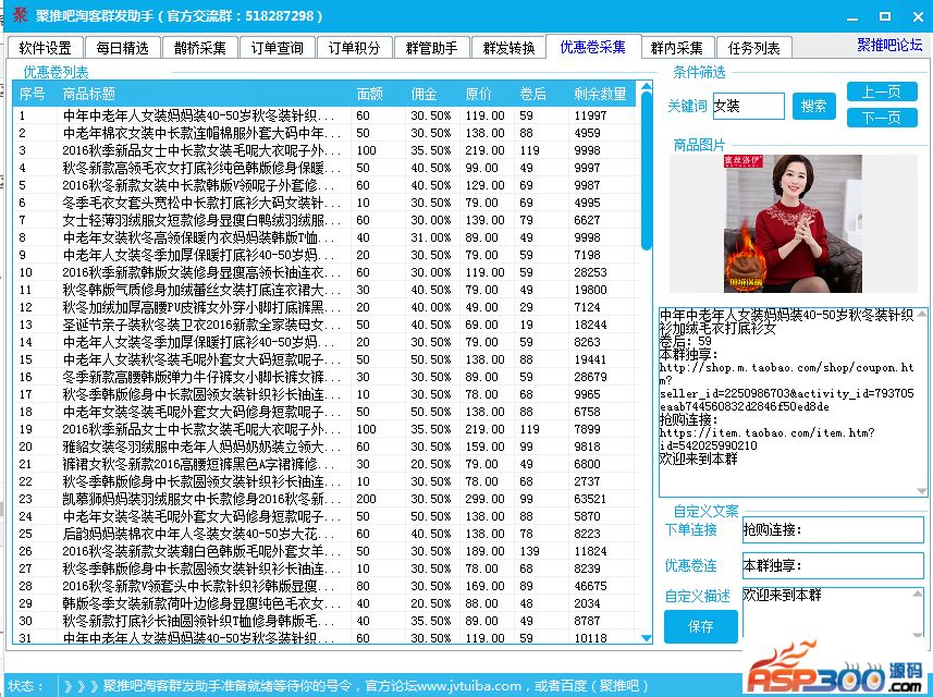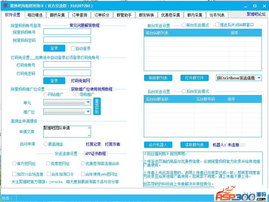功能还是非常的全面的,全自动采集,全自动群发,阿里妈妈掉线自动登录,48小时全天挂发单,后台发送不影响工作。