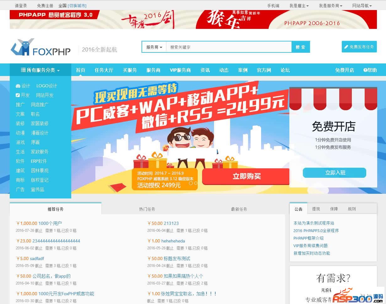 FoxPHP威客系统是大型多用户多店铺,B2B,C2C,O2O悬赏系统,服务商(威客卖家)网上提供服务,雇主(买家)付费购买服务的在线交易平台。