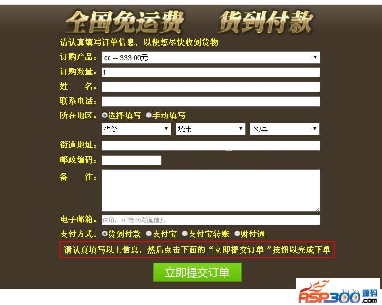 提示:运行首页的订单提交前,必须先在后台添加好产品并更新,否则前台提交时会出错。