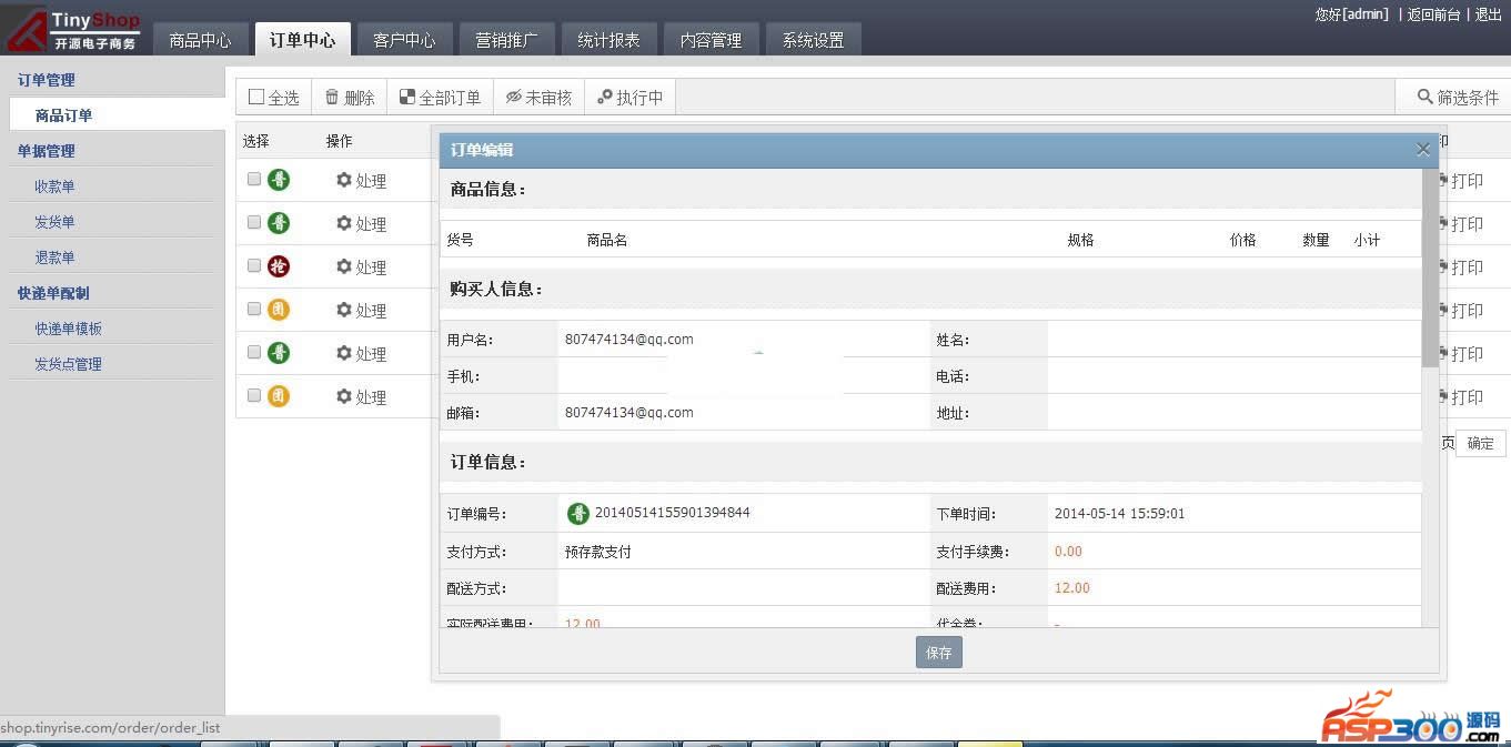 订单中心:商品订单、收款单、发货单、退款单、快递单模板、发货点管理