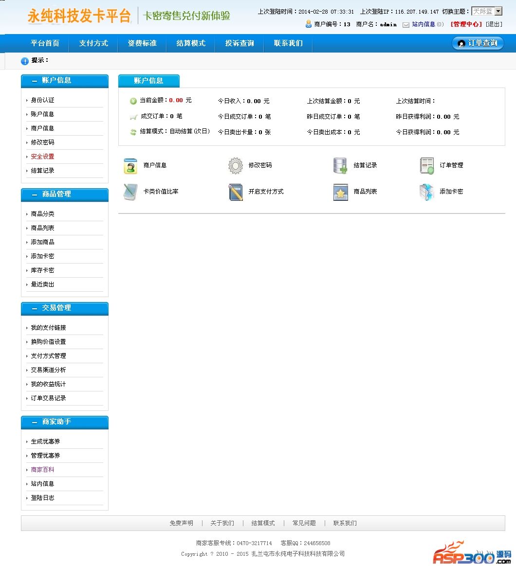 php自动发卡平台 v3.9 更新内容:1、【新增】主站模板新增2套 。2、【新增】商户中心模板新增3套。3、【新增】购买页面风格新增4套。4、【新增】添加支付宝免签约即时到帐接口。5、【新增】永纯API接口文件。6、【新增】70卡世界接口文件。7、【新增】易收卡接口文件。8、【修复】批量提交卡密错误。9、【修复】程序查看举报错误信息。