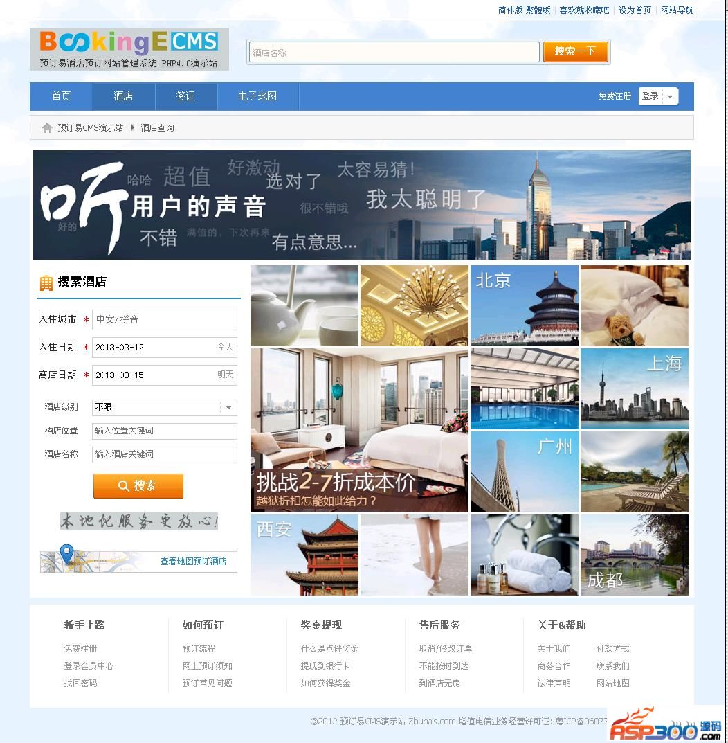 酒店预订管理系统BookingE HotelCMS v8.6.217 更新日志1、前台界面全新改版,更适合宽屏,大气美观。HOT2、全新手机版,支持全模块预订,门票,自助游,团购/活动。HOT3、手机版支持整合攻略版块,便于微信/微博推广。HOT4、手机版酒店整合预订易酒店数据。5、新增微信公众平台接口。HOT6、优化在线支付处理。7、一些小Bugs修复。