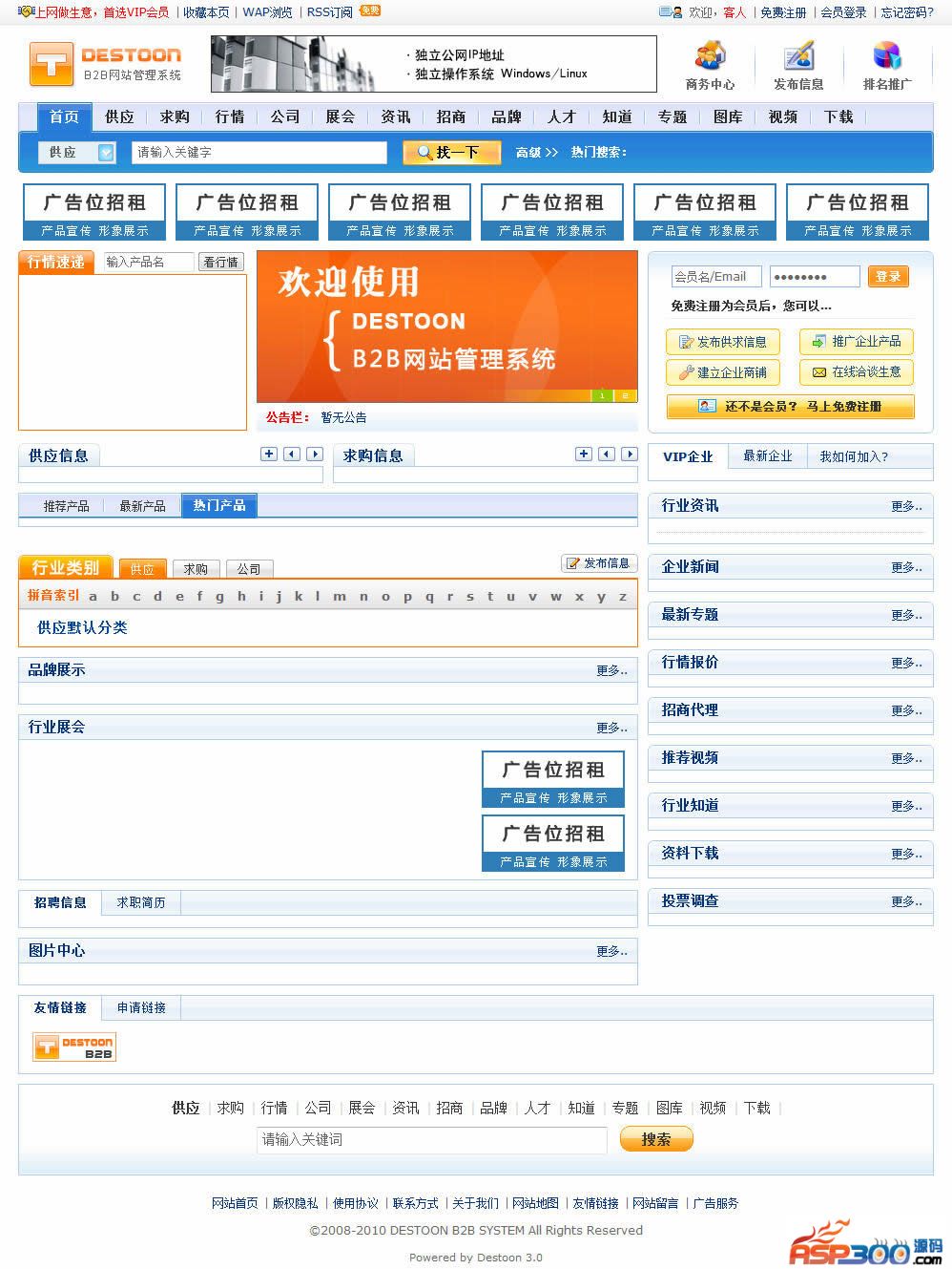 Destoon(B2B网站系统)是一套完善的B2B(电子商务)行业门户解决方案。系统基于PHP+MySQL开发,采用B/S架构,模板与程序分离,源码开放。模型化的开发思路,可扩展或删除任何功能;创新的缓存技术与数据库设计,可负载不低于百万级别数据容量及访问。