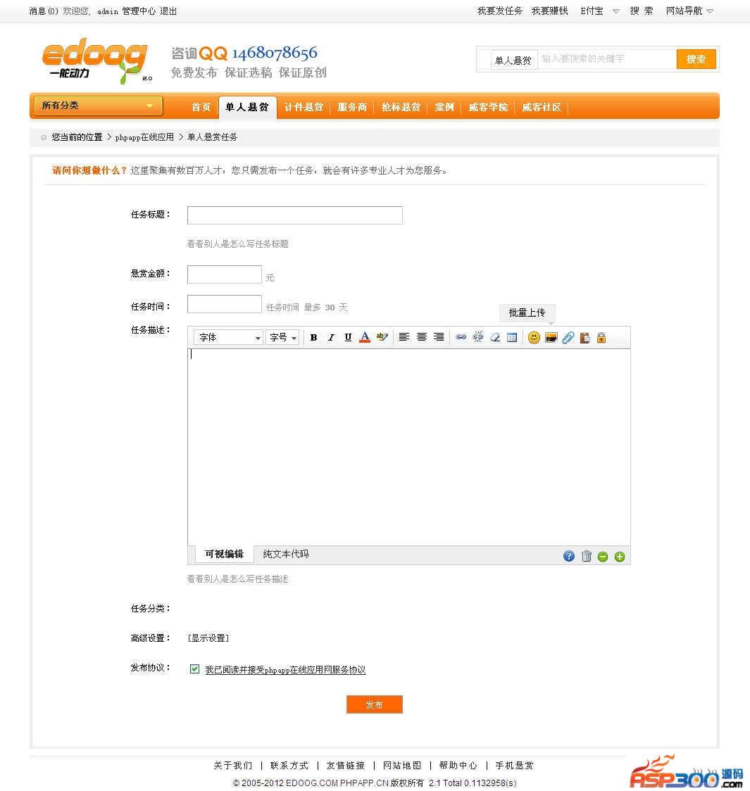 PHPAPP 是EDOOG 旗下新产品,全球领先的网站应用系统。PHPAPP 全球网站应用的开创者,独创系统核心长期提供丰富网站应用程序,专为站长企业打造盈利应用。威客交易程序 站长赚钱首选程序!!!安全: 独创全ID URL直接屏蔽SQL注入问题,提供过虑系统对提交的数据进行过虑。高效: 独创 AVC ( 应用Application 视图 View 和控制Controller ) 面向过程垂直设计,程序逻辑清晰运行速度快。双核心: 独创 www 网站系统 支持 wap 手机系统 双核心,一程序多显示多用途多语言: 独创独立语言包,多语言显示扩展: 独创无限应用安装扩展应用与windows软件一样安装,卸载简单,应用独立系统其它升级安装不影响应用运行,二次开发学习简单。1.完美的 应用扩展二次开发应用直接后台创建,安装应用支持批量安装 zip 压缩包或安装解压包,无限的扩展体系。应用拥有独立的 权限;配置;管理等只要您想得到的应用,都能开发实现。2.完美的 优化SEOPHPAPP 支持 自定义 伪静态URL和生成HTML静态部属,与应用的SEO设定完善解决 SEO优化问题。可以对URL进行改名,URL地址想怎么变就怎么变。3.完美的 帐务管理当时用户交易情况如 交易金额;交易对象;资金流向等详细记录,并与订单关联,可以追踪到某个任务上。交易金额的来龙去脉一目了然。4.完美的 编辑器edoog 自主开发的 edoog 2.0 编辑器与系统完美结合,支持 隐藏;批量上传图片;上传文件等并显示进度。并提高用户上传图片附件的操作体验5.完美的 任务流程任务模拟商品交易流程,交易时生产订单,可对订单批量管理,发货,支付,退款等流程。6.完美的 任务操作任务前台 支持 批量 中标;不合格;点评等会员中心支持 批量 发货,支付订单管理7.完美的 后台管理员配置通过配置应用权限,生成出应用的动作权限,高达上 1000 个权限控制.把后台管理权限分配到应用动作每个页面上。8.完美的 接口配置消息接口;邮箱接口;动态接口;短信接口;积分接口; 等,可以把应用配置并设置用户组使用权限使用这些接口。使应用能发送消息,动态,短信等。9.全新的 开发人员工具功能可以调用数据与设置模块,生成的标签写在模板,前台的每一点一滴都在后台控制。10.全新的 后台风格使用全新的传统风格让更多站长操作更方便。11.全新的 语言管理功能前台后台支持多语言切换。12.全新的 道具商店功能目前现在 7~8 种道具,用户购买道具网站直接营利,道具将持续开发让站长赚钱更简单更轻松。13.全新的 单人悬赏功能全新开发的单人悬赏支持批量操作;诚信设置;使用道具;流程完善批量操作: 采纳;不合格;点评;发货;支付等诚信设置: 防止用户恶意不选稿退款等操作,当用户设置诚信后按诚信进行操作,提高任务的交易。使用道具: 可以将任务置顶在列表,显示地图方位,设置隐藏等操作,用户购买后网站获得营利。流程完善: 任务的每一步流程都与订单关联,支付,退款等实现交易体系的完善。14.全新的 计件悬赏功能全新开发的计件悬赏支持批量操作;诚信设置;使用道具;流程完善功能同单人悬赏外,计件采用新的倒计中标算法。什么是倒计中标?就是按多少量进行中标并排除中标的稿件,只做剩下的名额并稿件只能投剩下名额。到期后如有剩名额,系统直接退款剩下的名额赏金。保证了雇主的权利,同时又保证了投稿不浪费的合理性。15.全新的 抢标悬赏功能全新开发的抢标悬赏支持批量操作;诚信设置;使用道具;流程完善功能同单人悬赏外,抢标悬赏与服务商资源进行整合。当用户投标时,系统读取用户所卖的服务 报价,时间,信用等,先投标排名在前有抢标的优势。雇主选出满意的服务商后即中标,双方进行交易。保证了雇主的权利,同时又保证了投标不浪费的合理性。16.全新的 微博悬赏功能1.0(全自动版)全自动版微博支持 关注;转发;点评;操作当用户操作后按用户的 粉丝 立即获取赏金。目前该版本接口为 1.0程序企业适用17.独创的 链接悬赏功能(全自动版)EDOOG全球首创链接悬赏 站长10秒钟 100%中标赚钱EDOOG完美的实力全力开发站长企业赚钱应用什么是链接悬赏?链接悬赏就是友情链接悬赏交换新站长做友情链接很难,所以只能用钱购买大站的链接交换.但找不到做链接交换站长。所以EDOOG针对这问题推出链接悬赏链接交换作用?链接交换来使新站获得访问量、增加用户浏览、在搜索引擎排名中增加重权收录、通过合作网站增加访问者的可信度等等链接悬赏功能使用方法?发布悬赏 -> 站长做好链接提交 -> 系统检测是否合格-> 站长中标得到赏金站长整个过程10秒就可以拿到赏金,史上中标最快最安全的应用悬赏。18.独创的 Wap手机功能当您开发完成PHP应用后,wap手机功能也自然的开发完成,只需修改手机风格页面。双核心,一程序多显示多用途,让程序赶上时代步伐。