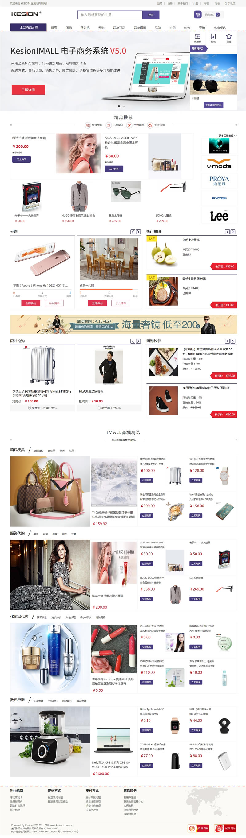 KESIONIMALL在线商城系统经过KESION电商全体研发人员的不懈努力下,KESION(.NET版系列)之KesionIMALL电商产品终于上线啦!!相对之前的版本,此次新版5.0全新MVC架构,清新靓丽的多模板风格,定让您目不暇接;“PC版+手机版+微商城+APP四合为一”,同一后台、统一数据库,以最低的成本,最快速的方式搭建专属网站!