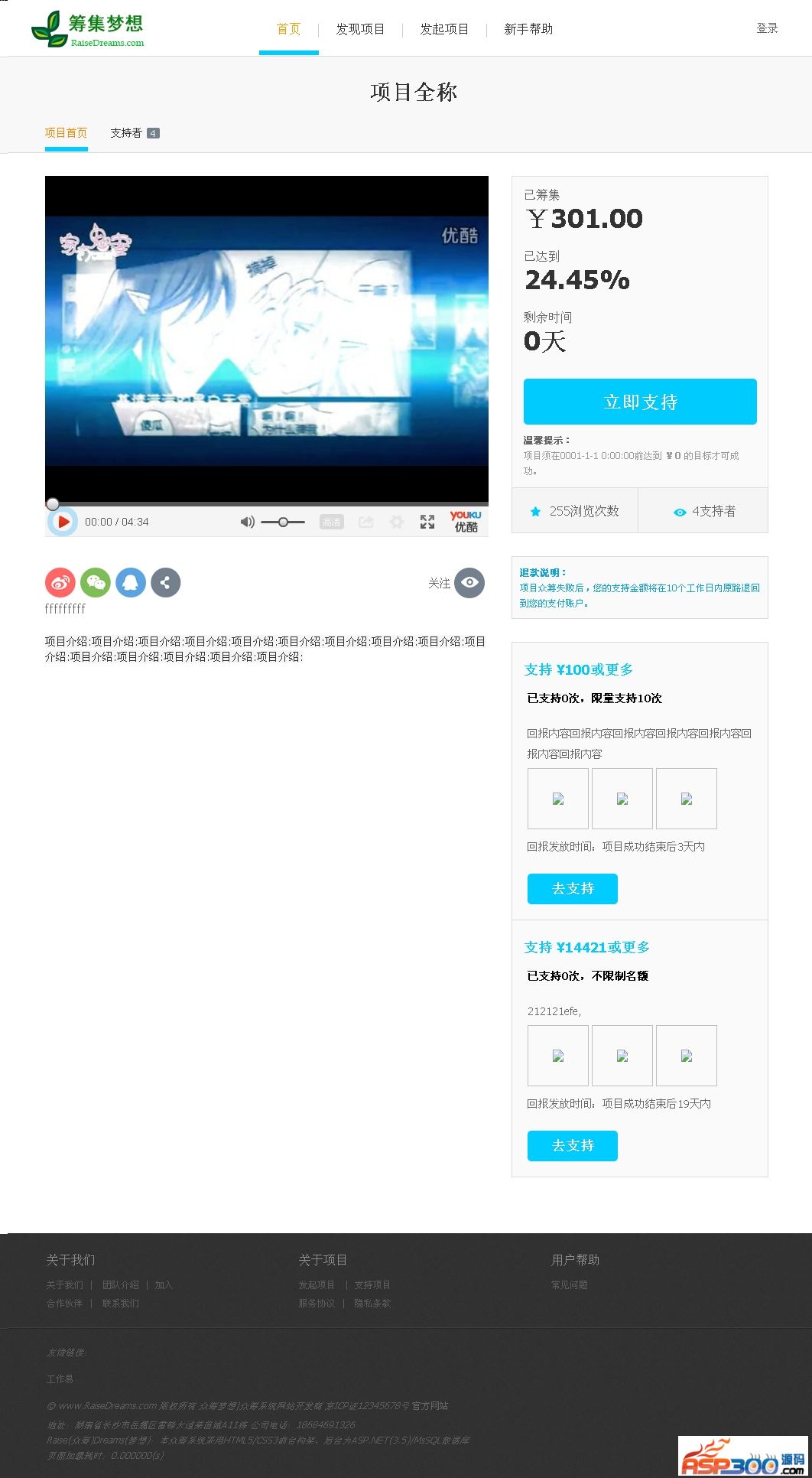 RaiseDreams意为众筹梦想。是为即将投入众筹行列的金融大亨及企业准备的一款企业级的众筹网站平台,采用asp.net+MsSQL数据库为系统架构,前台采用html5+css3现代html语言打造而成的高品质的在线众筹网站平台。