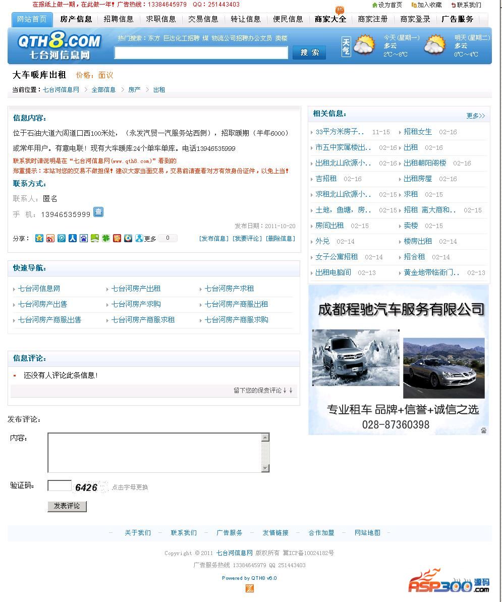 QTH8分类信息系统(七台河地方分类信息网)采用Asp.Net 2.0 + SqlServer 2000开发,无需安装,直接上传即可,本系统需要支持伪静态才能使用,设置脚本映射:将html映射为aspx。